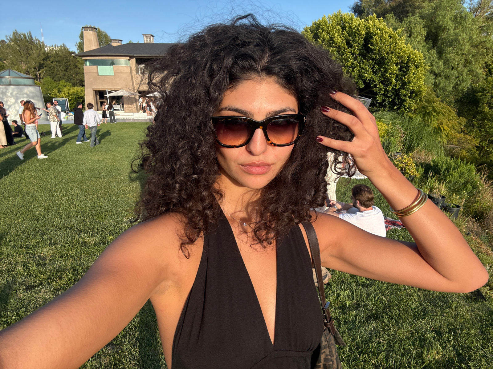 A woman with curly dark hair, wearing sunglasses and a black dress, is lying on grass outside in a sunny, outdoor setting, potentially in Los Angeles. She is touching her hair with her left hand, whic…read more