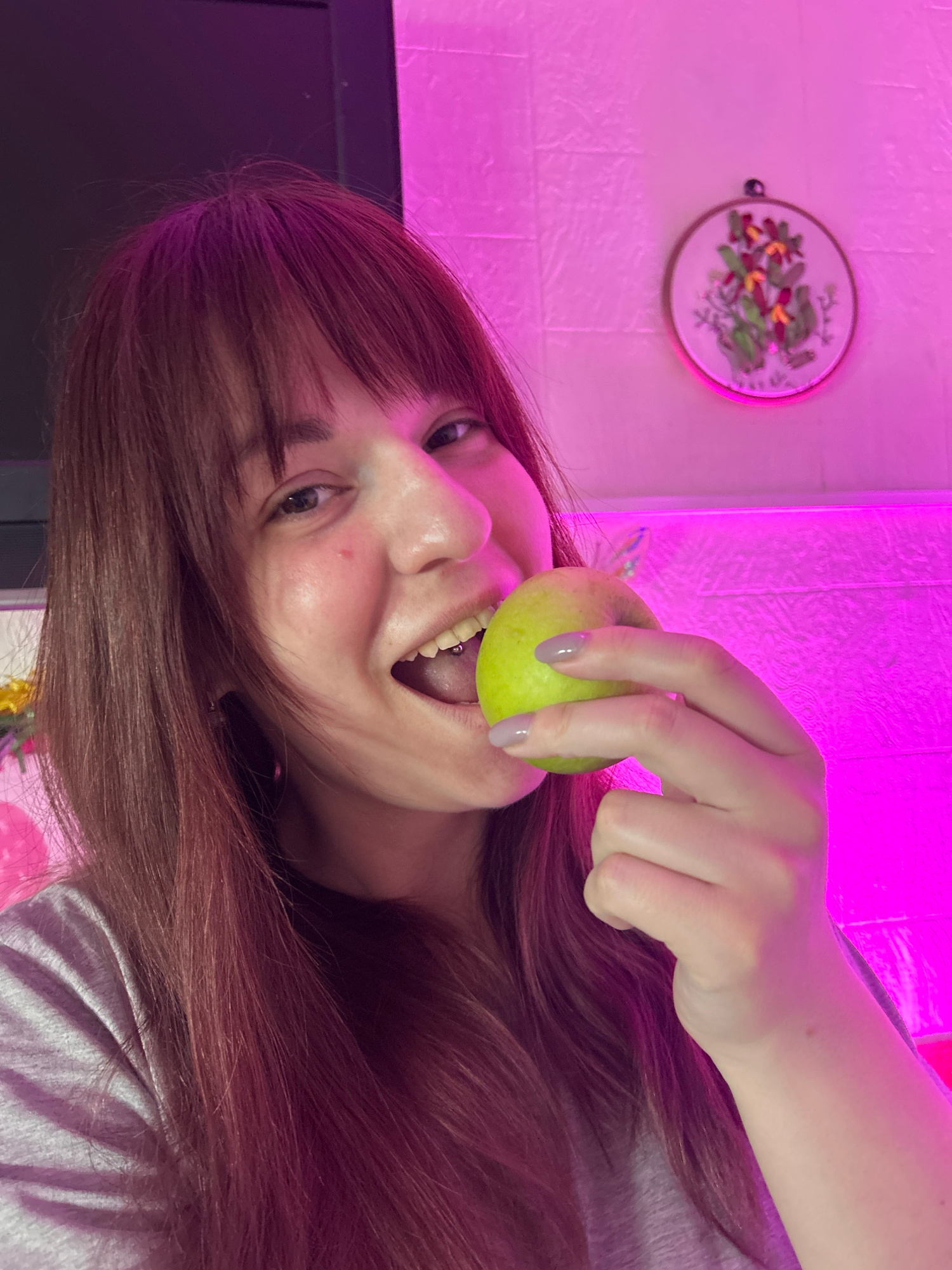 The image presents a rotated, close-up portrait of an individual in an indoor setting, bathed in vivid pink lighting. The primary subject is a person, likely female, with long reddish-brown hair frami…read more