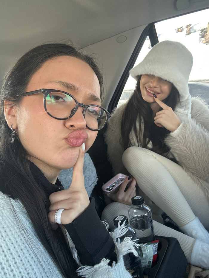 The scene depicts two females inside the passenger compartment of a vehicle, in Jraber, Armenia. The female in the foreground, positioned to the left, has dark hair, wears tortoise-shell glasses, and…read more