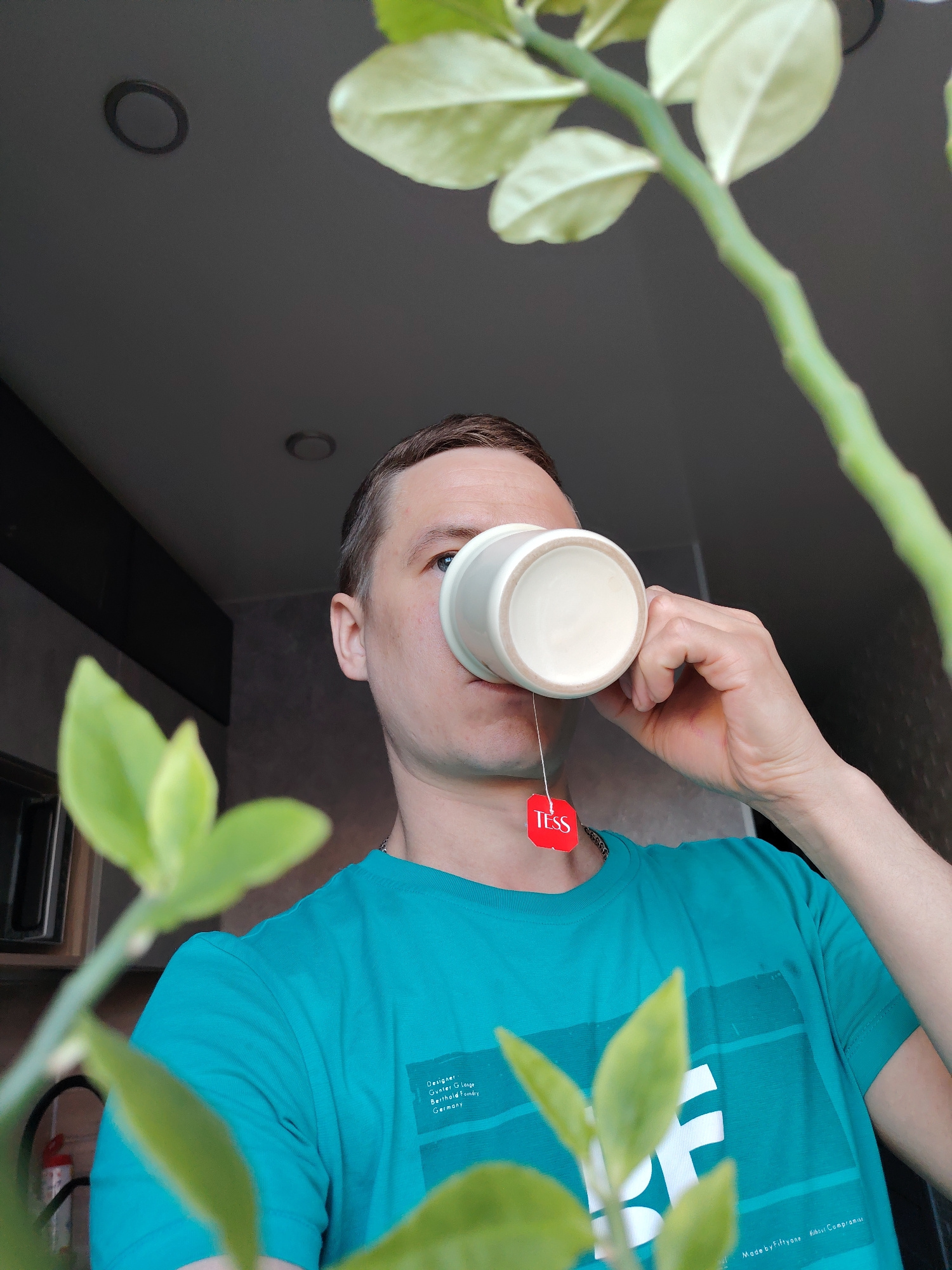 An eye-level shot captures a man drinking tea indoors in Chaikovsky, Russia. The man, with short brown hair and fair skin, is seen from the chest up, angled slightly to his right, with his left blue e…read more