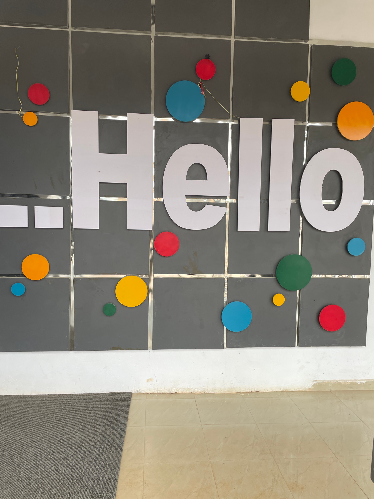 The image displays a decorated wall featuring large, white, vertically stacked letters spelling "HELLO HI" in a bold, sans-serif font. These letters are mounted on a background of dark grey square til…read more
