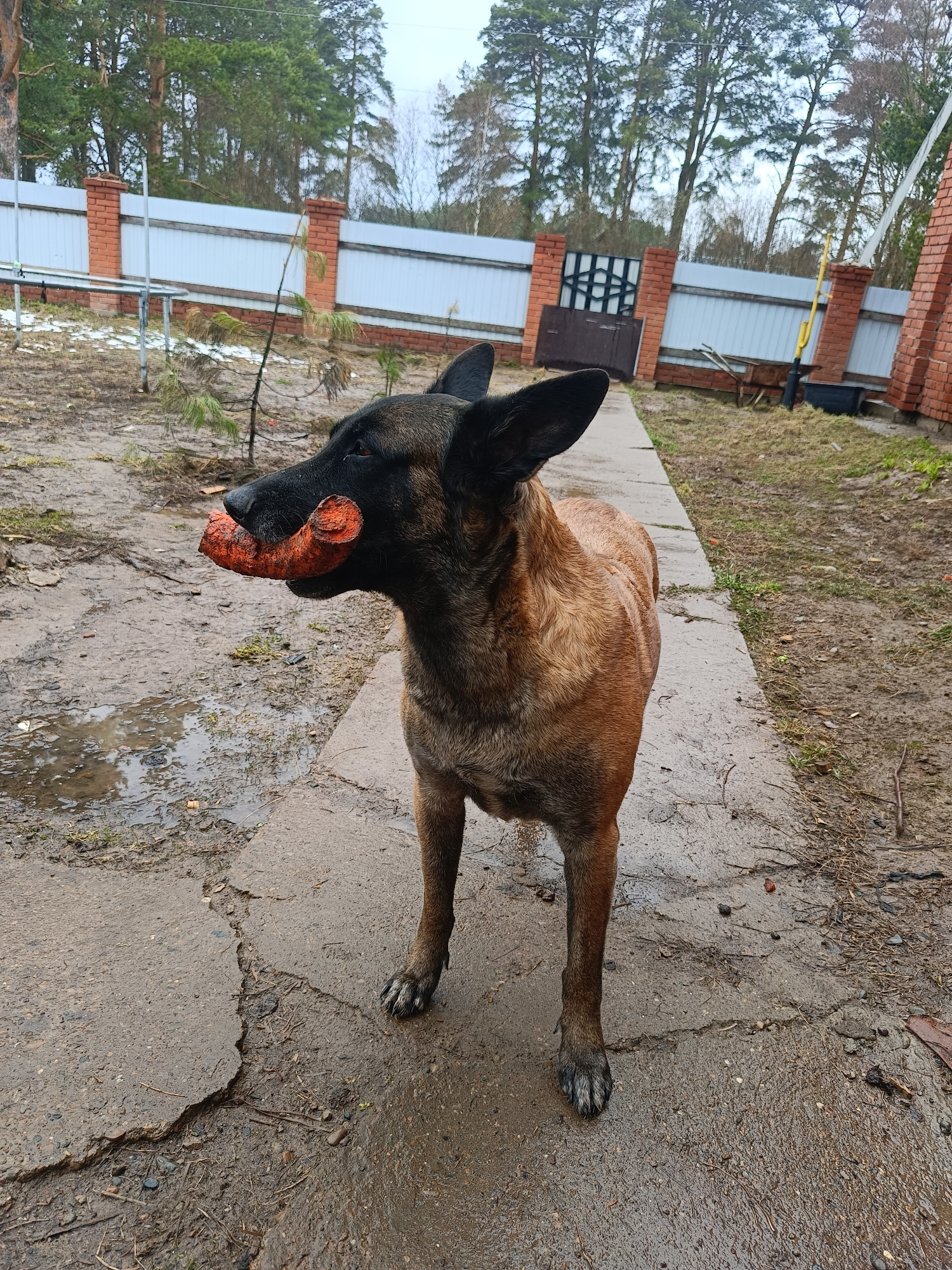 A tan Belgian Malinois dog stands on a cracked concrete path, holding an orange object in its mouth. The ground is muddy with small puddles. A white and red brick fence runs along the back of the scen…read more