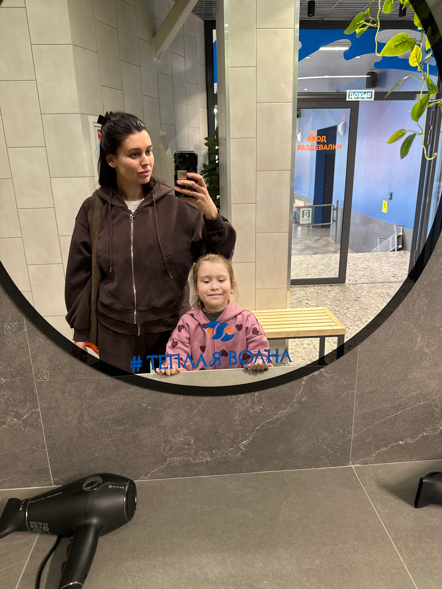 The image shows a reflective view inside a building, possibly a recreational facility, in Votkinsk, Russia. A woman with dark hair and a brown tracksuit is taking a selfie with a young girl who is wea…read more