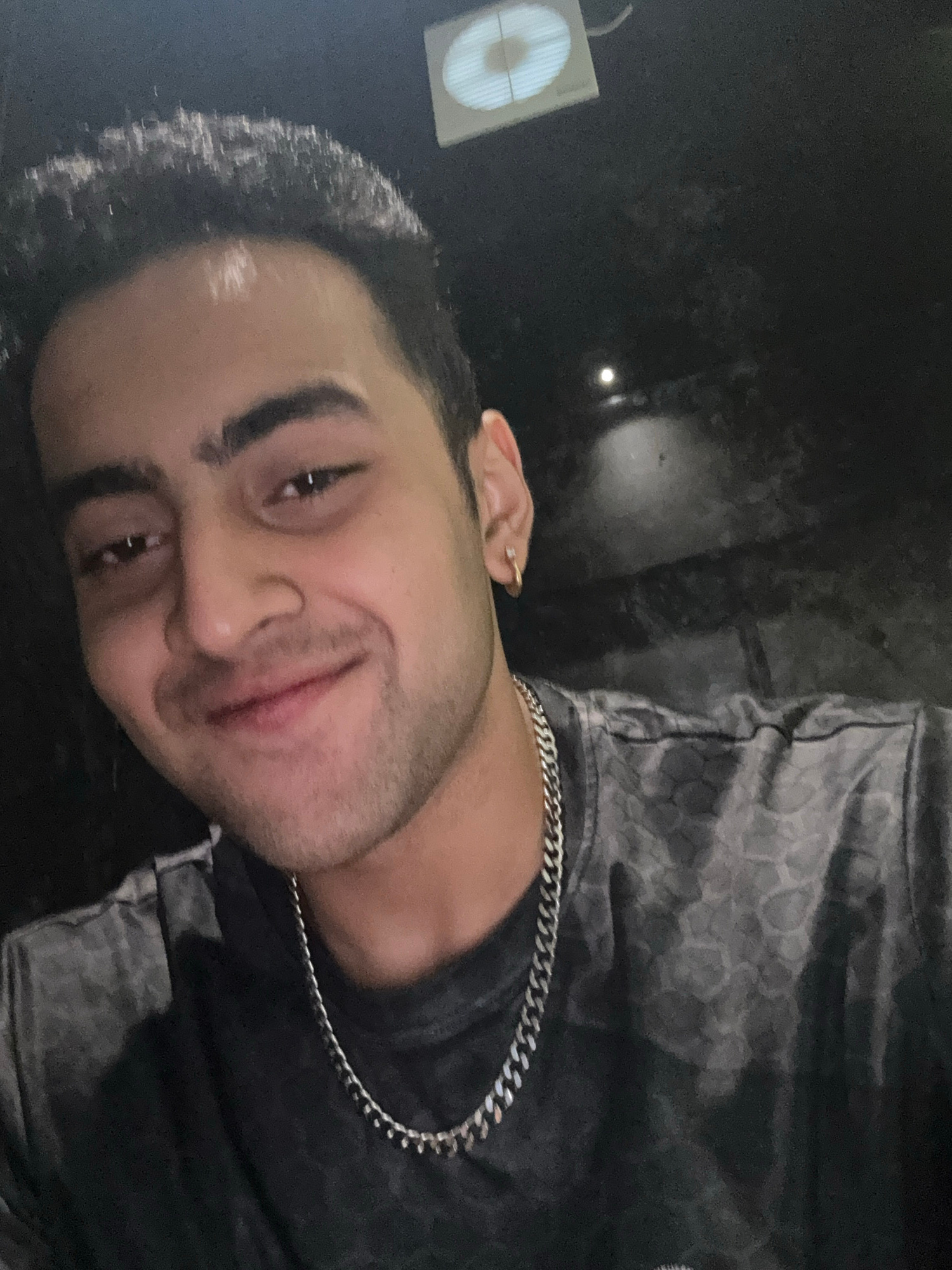 A close-up, slightly angled portrait of a dark-haired man with brown skin. He is wearing a dark shirt with a pattern and a silver chain. A light fixture is visible in the upper left corner. The locati…read more