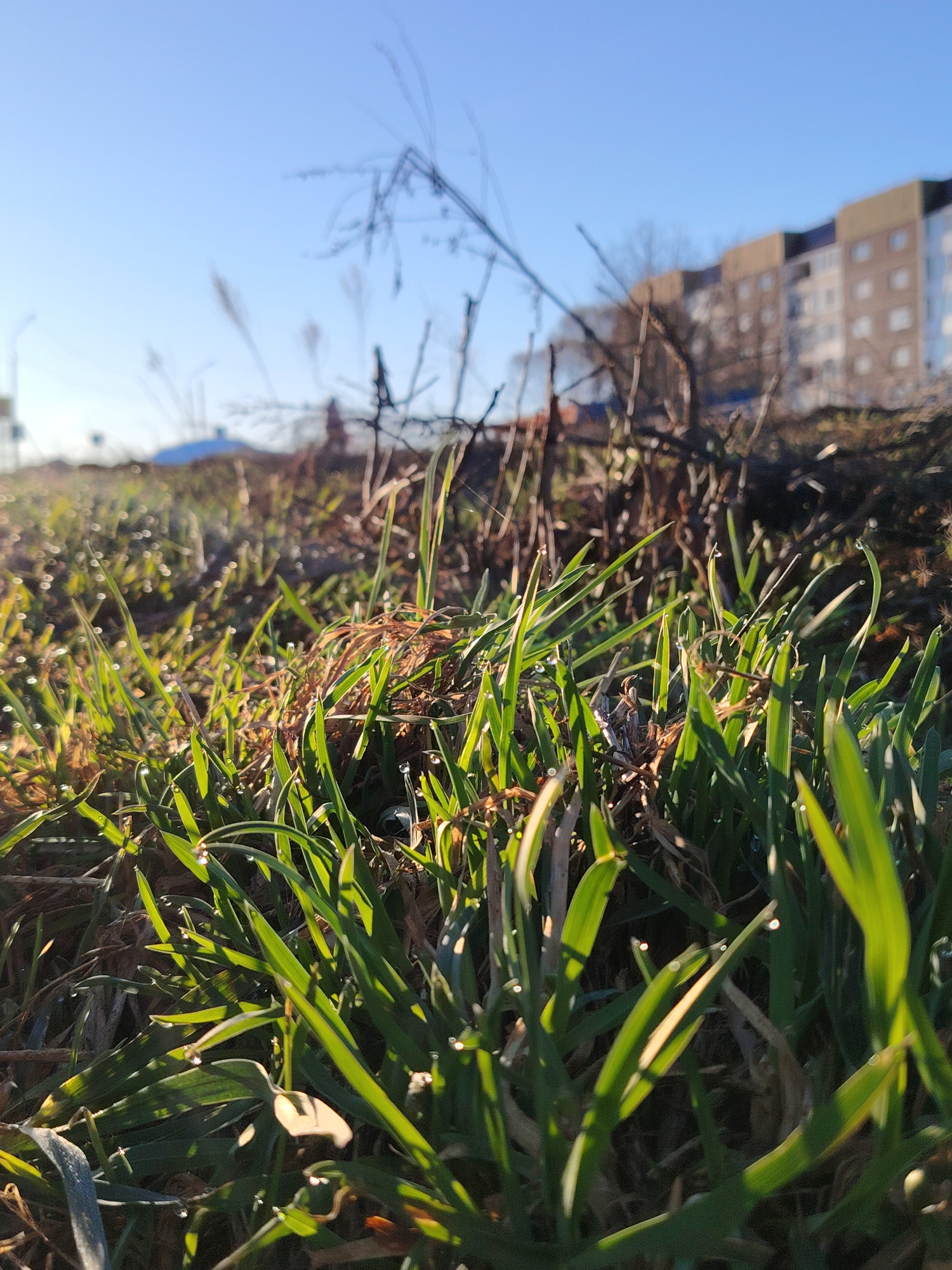 The image depicts a close-up view of grass blades covered in dew, illuminated by sunlight. In the background, out of focus, is a multi-story building with multiple windows. Bare branches and other fol…read more