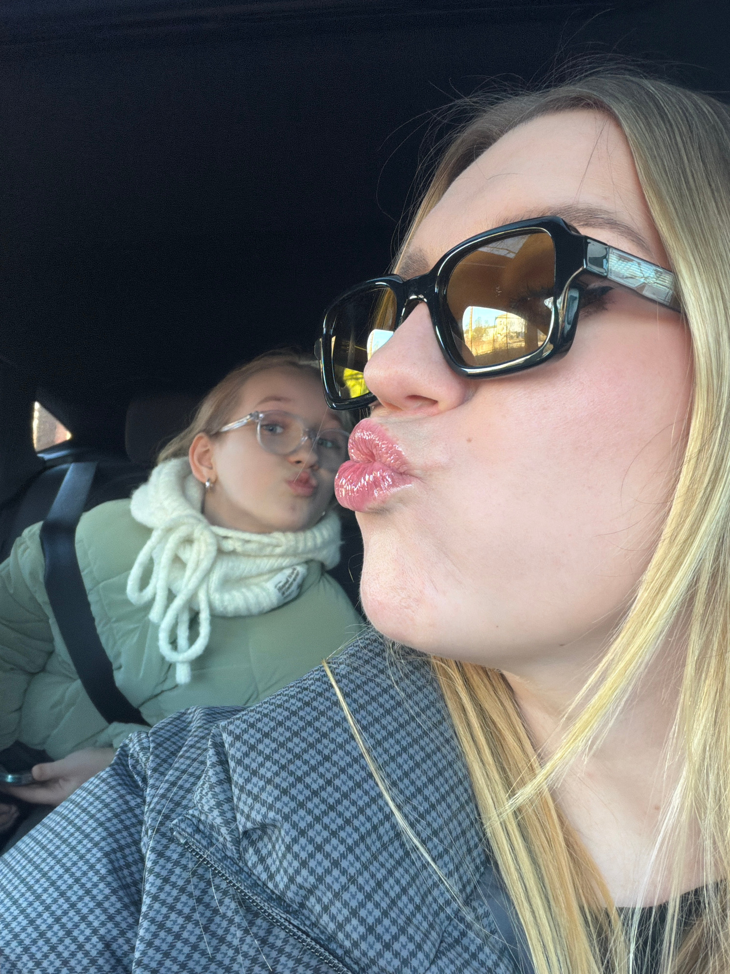 Two blond-haired females are pictured in what appears to be the inside of a vehicle. The face of the older female is in the foreground, tilted at an angle, and she is wearing sunglasses with black fra…read more