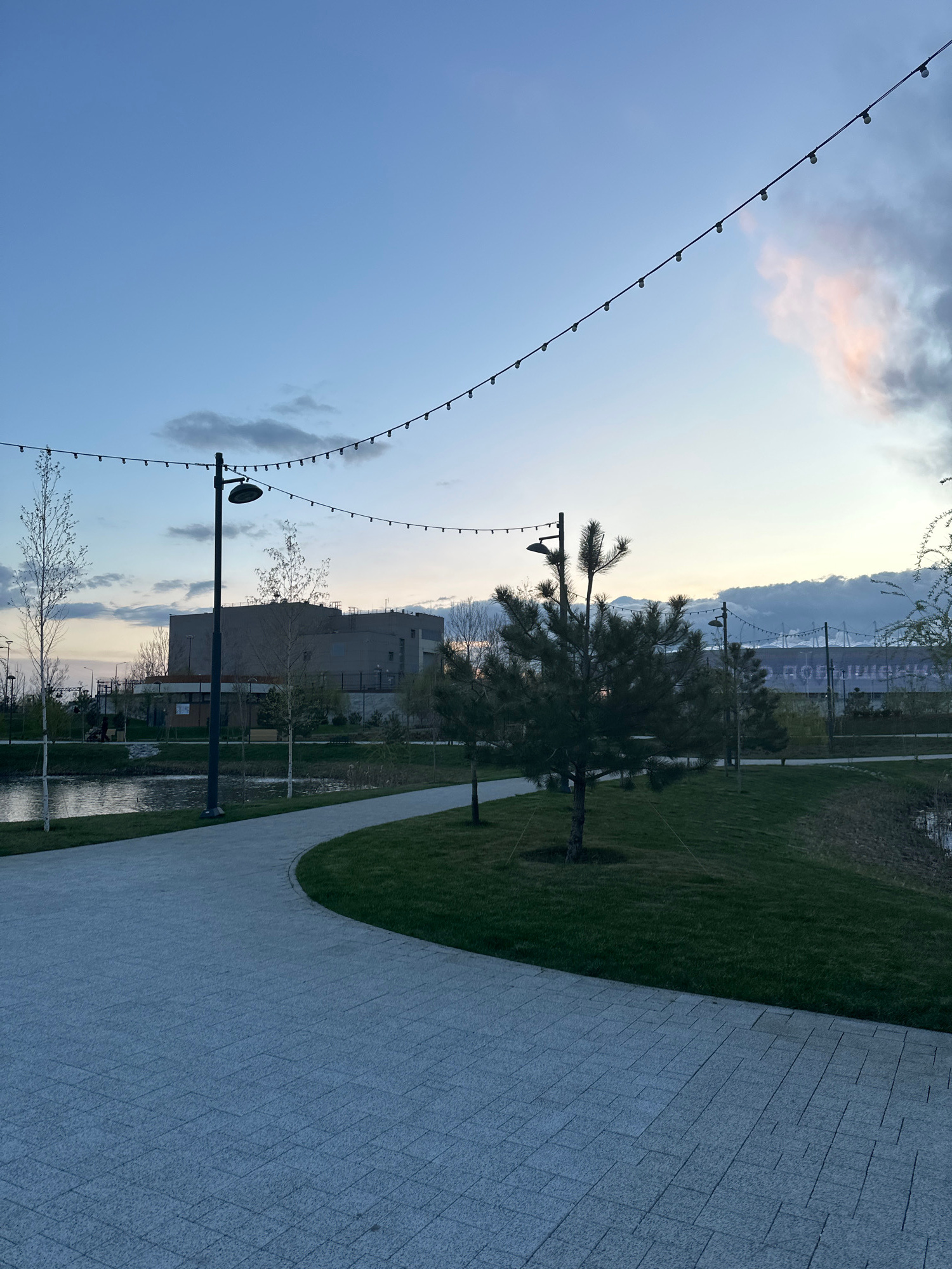 A park in Rostov-on-Don, Russia, features a curved, paved pathway bordered by grass. In the background, structures are partially obscured by trees. String lights are suspended above the park. Lighting…read more