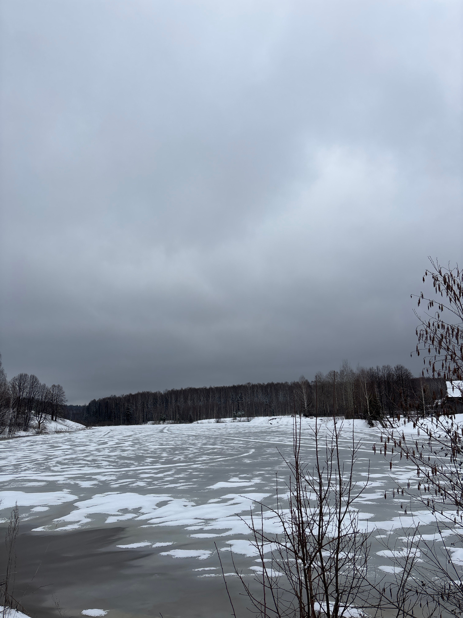 The image depicts a winter scene, likely a frozen body of water with a line of trees on the opposite bank. The sky is overcast. The landscape is sparsely populated with trees and covered with a layer…read more