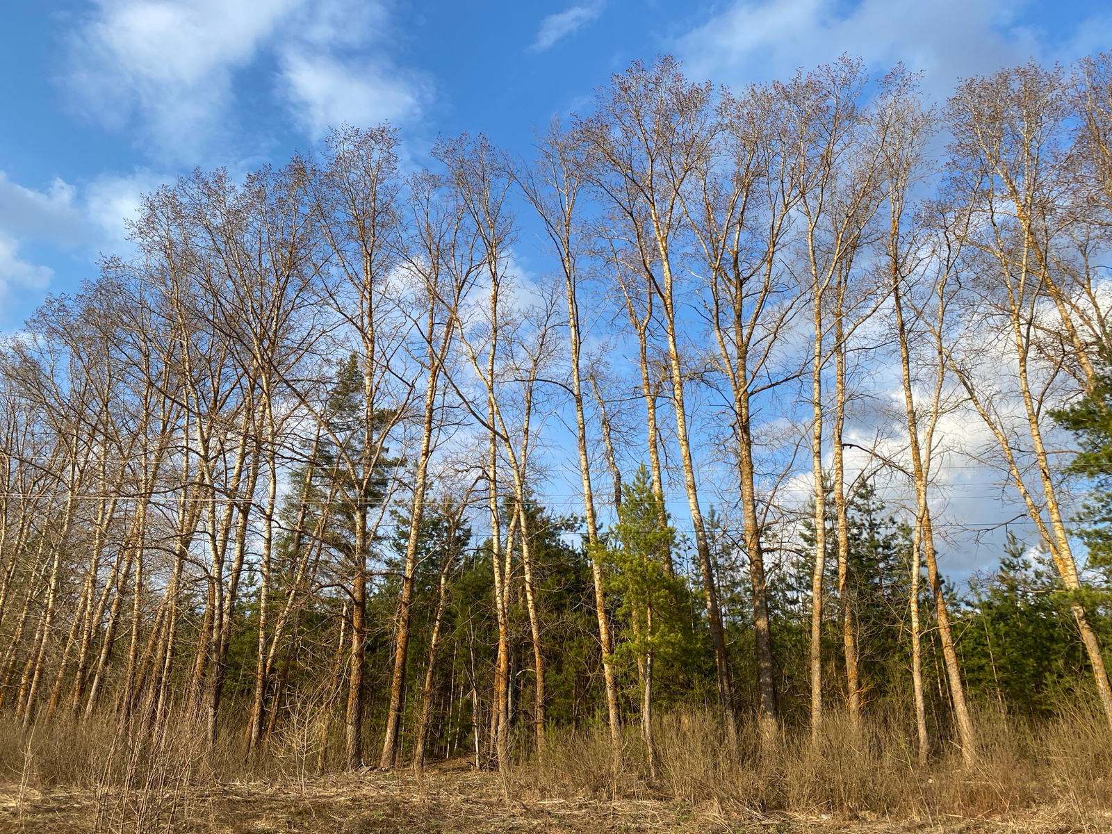 The image shows a dense forest scene in Kamennyi Kliuch, Russia, on a clear day with a blue sky and scattered white clouds. The foreground consists of dried grass and undergrowth. In the middle ground…read more
