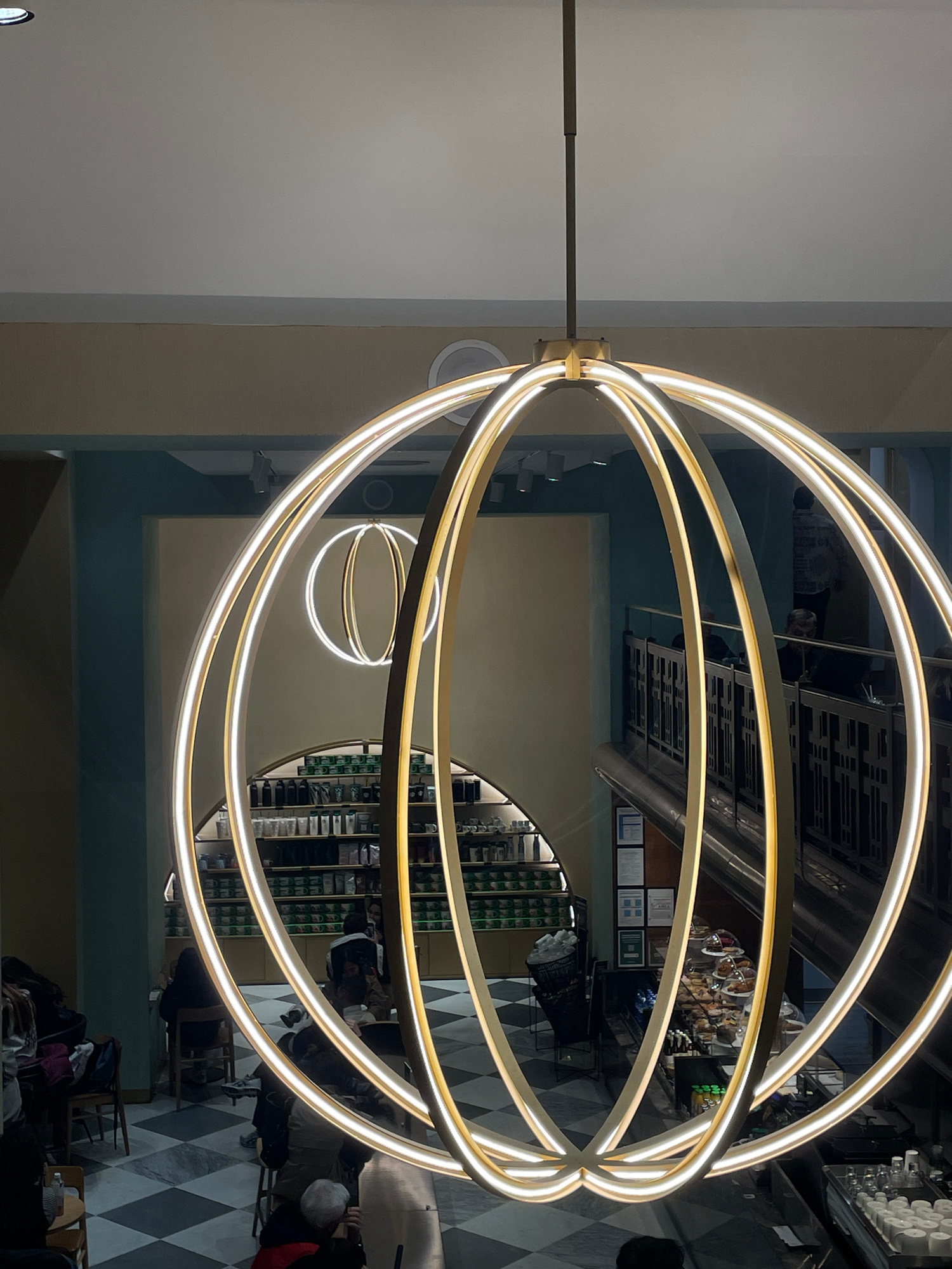 This image depicts the multi-level interior of Caffè Gambrinus, located in Naples, Italy. The foreground is dominated by a large, ornate spherical chandelier, constructed from numerous concentric gol…read more