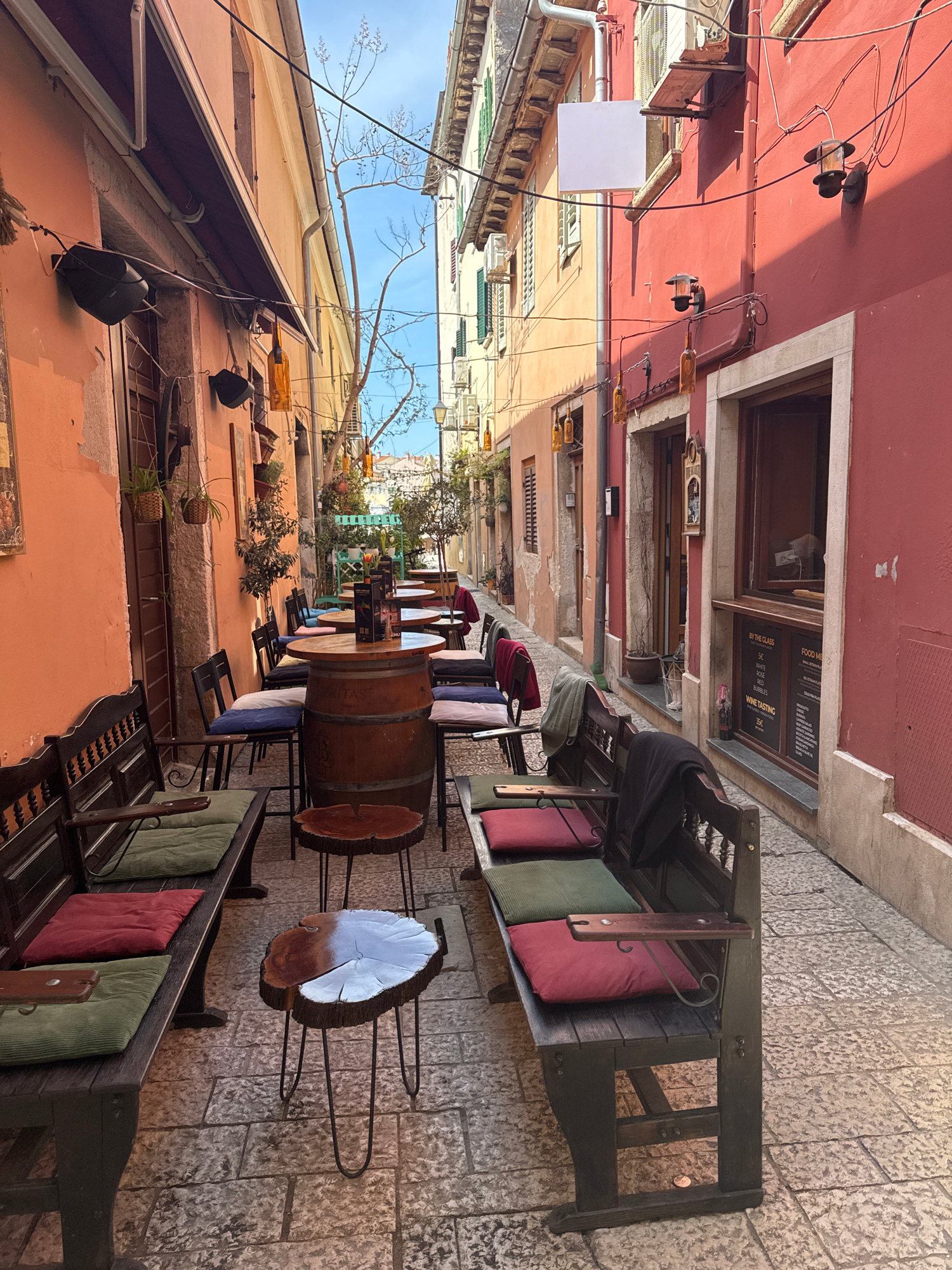 The image depicts a narrow street in Grad Rovinj, Croatia, lined with buildings of varying heights and colors, predominantly reddish-orange hues. Tables and chairs occupy the street, suggesting an out…read more