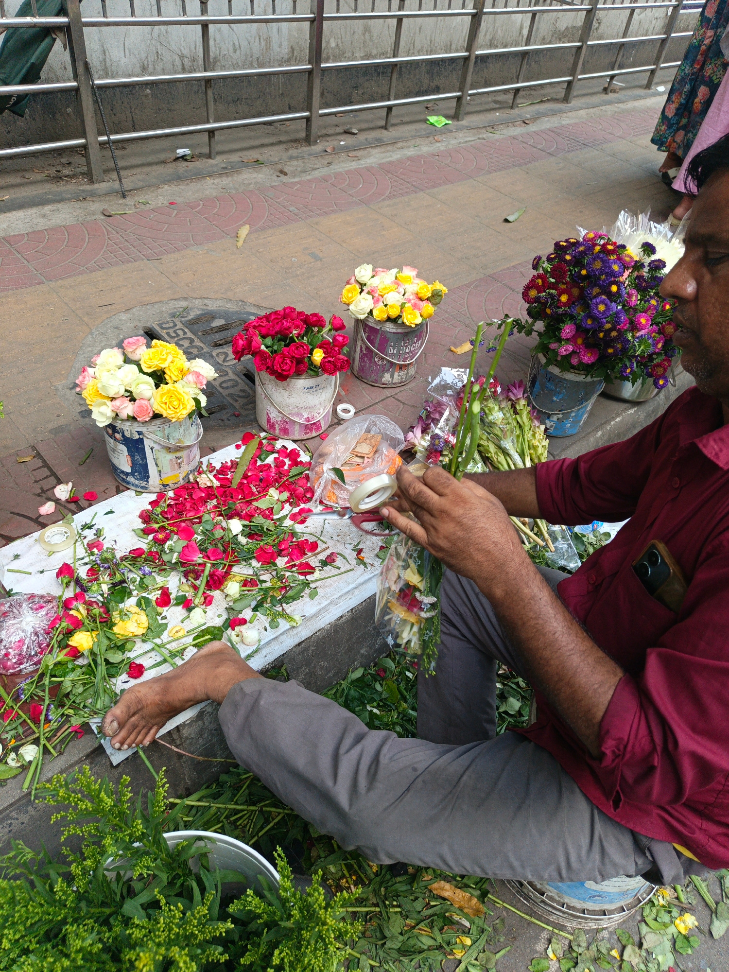 An Indian flower vendor sits cross-legged on the pavement on a city street in Dhaka, Bangladesh. The man is light-skinned with dark, thinning hair and a close-cropped beard. He is wearing a maroon lon…read more