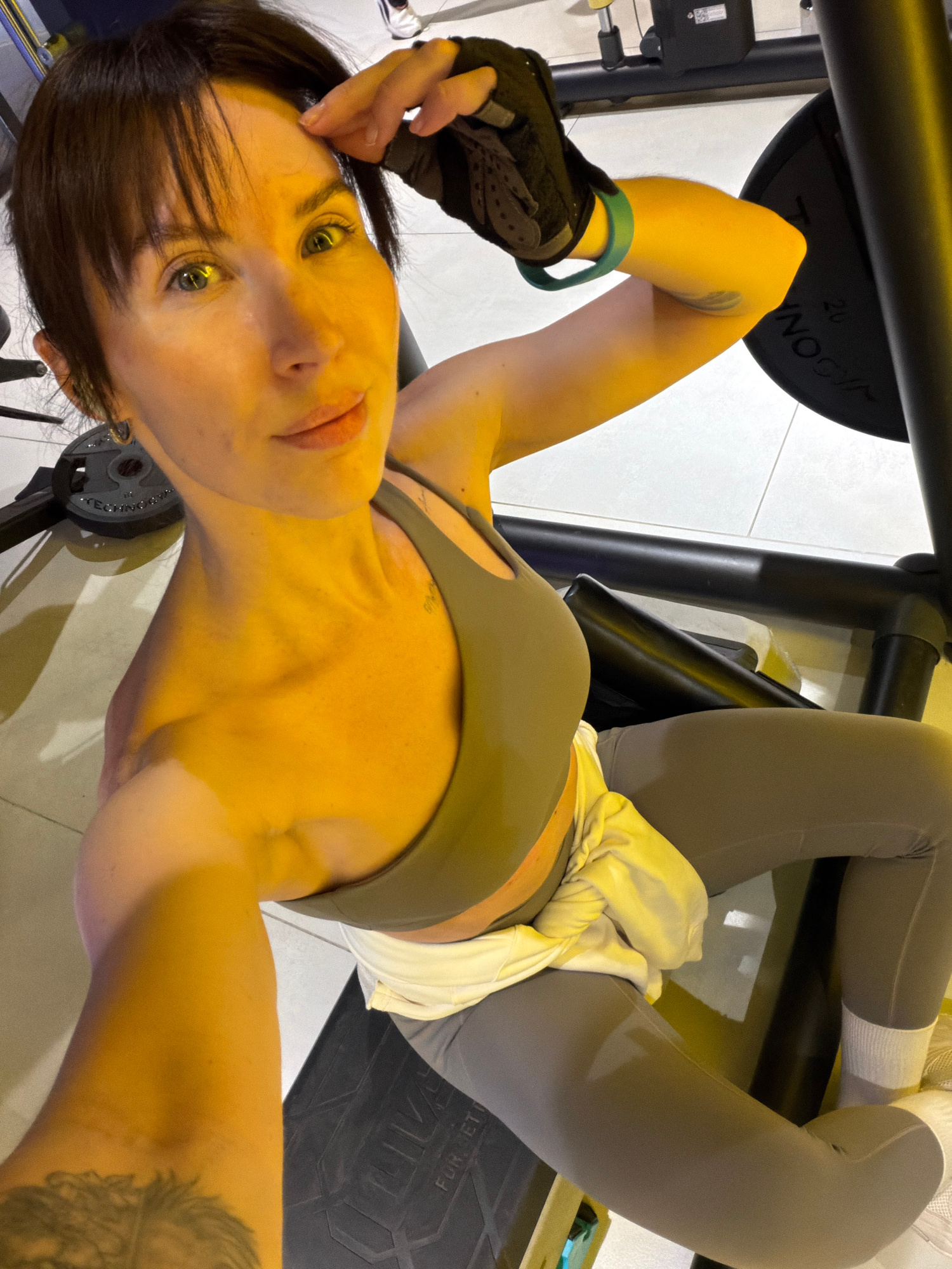 A woman is lying on a leg press machine in what appears to be a gym. She is wearing a sports bra, leggings, socks, and gym gloves. A white garment is tied around her waist. The gym has white tile floo…read more