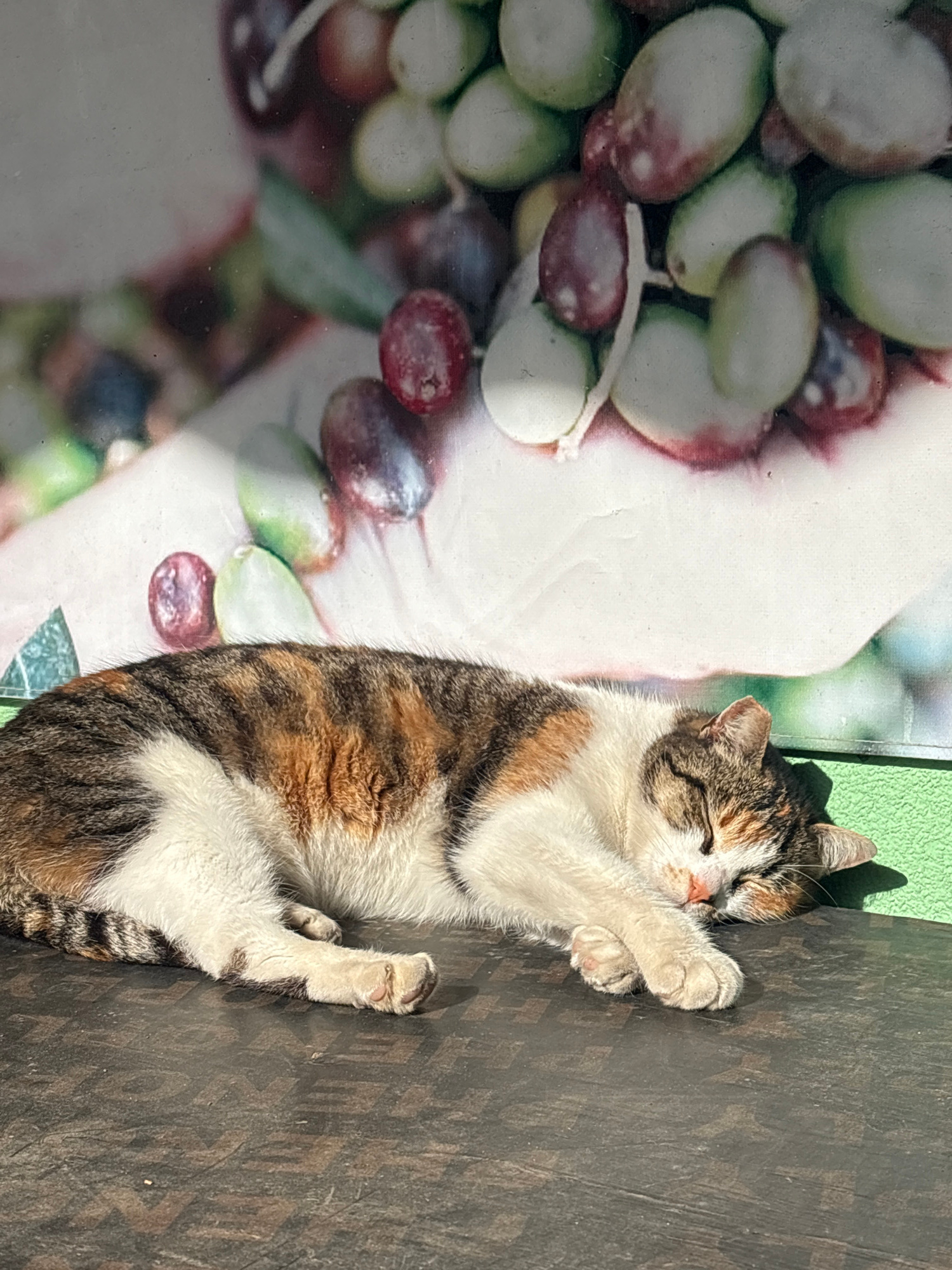A calico cat, predominantly white with patches of brown, black, and tabby markings, is captured resting or sleeping in bright daylight. The cat lies on its right side, with its head turned towards the…read more
