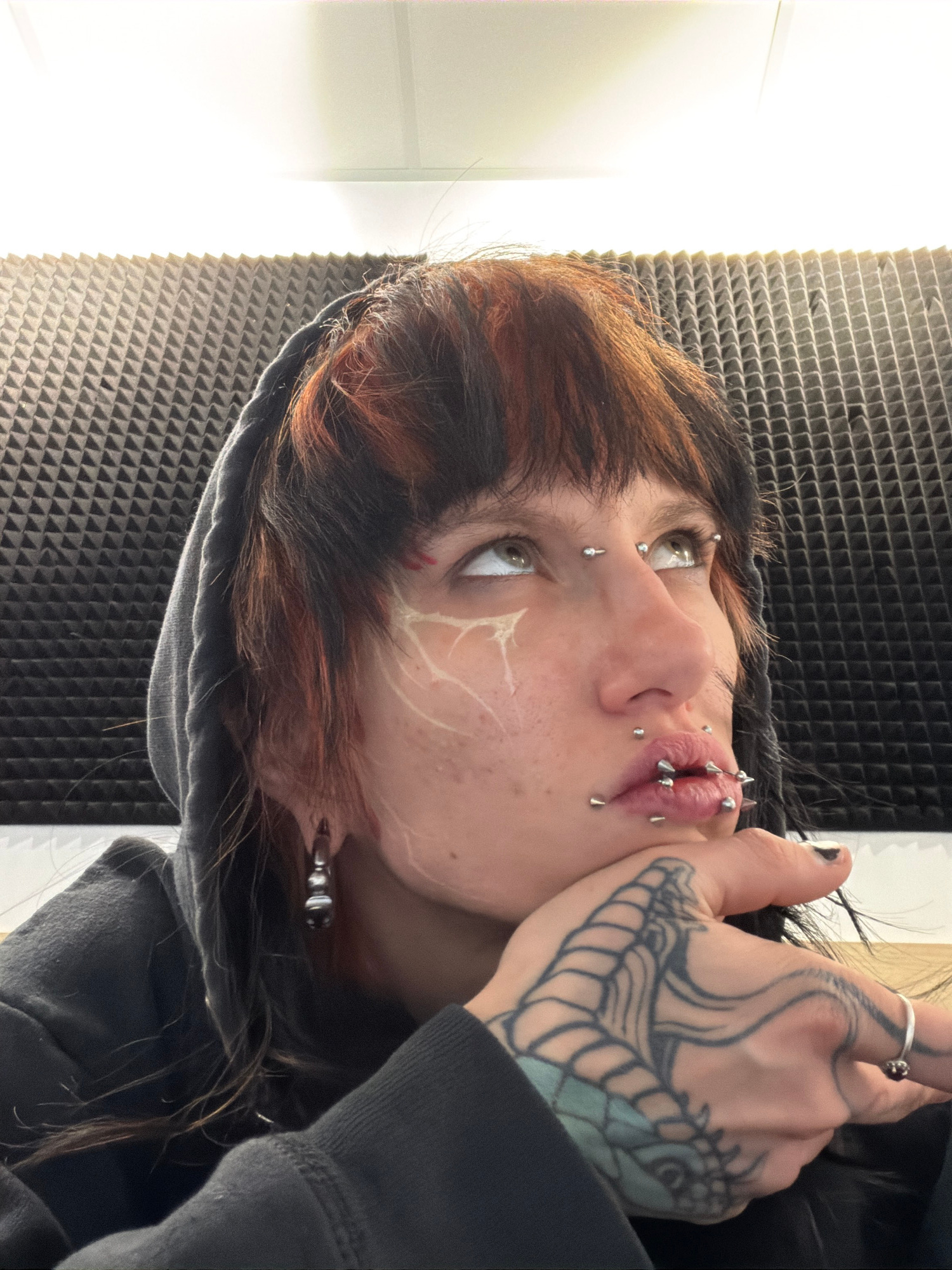 A person with multiple facial piercings, including lip and cheek piercings, and a tattoo on their right hand, is shown in an indoor setting. The person is wearing a dark hooded sweatshirt. Their hair…read more