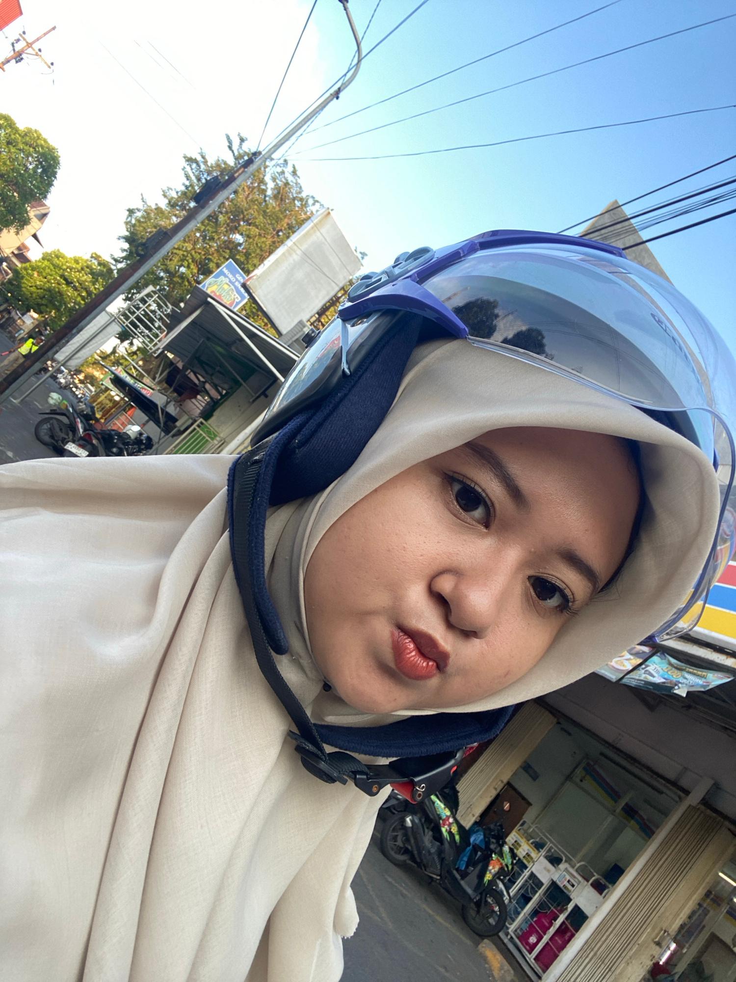 A medium shot of a person with fair skin, wearing a light-colored hijab, and a motorcycle helmet with a clear visor. The person is looking directly at the camera with a slight pout. In the background,…read more