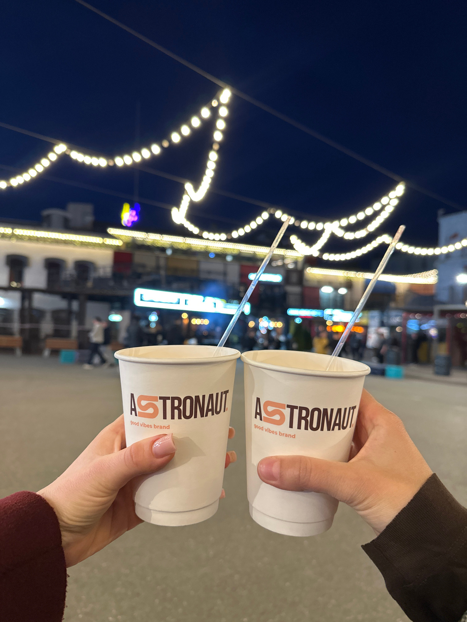 Two disposable white cups with the word "ASTRONAUT" printed on them are held in front of an outdoor scene. Each cup has a clear plastic stirrer inside. The background shows a dark blue sky, rows of li…read more