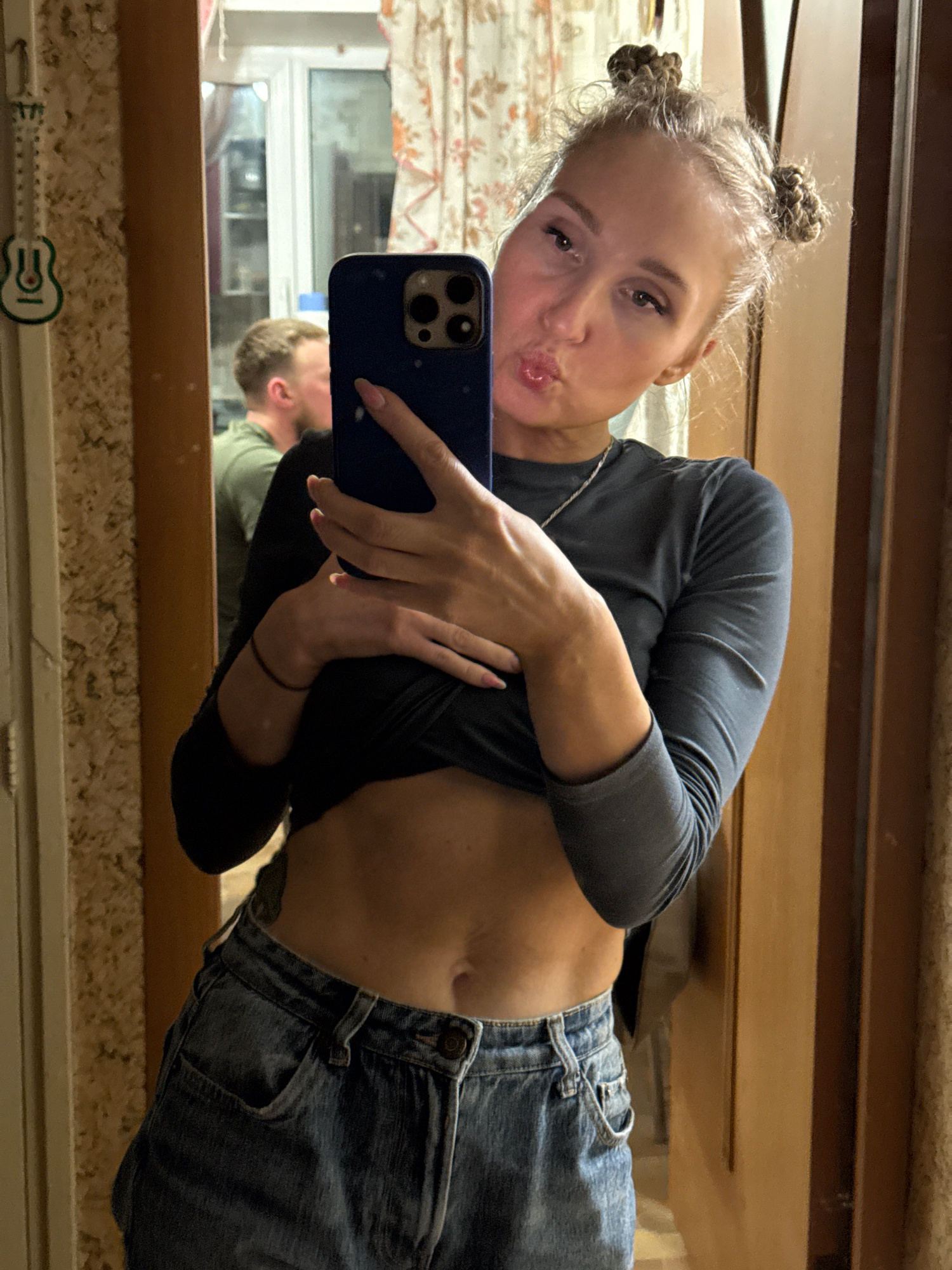 A woman with blonde hair styled in two buns is taking a selfie in front of a mirror. She is wearing a dark long-sleeved shirt and blue jeans, with a portion of her midriff exposed. She is holding a bl…read more