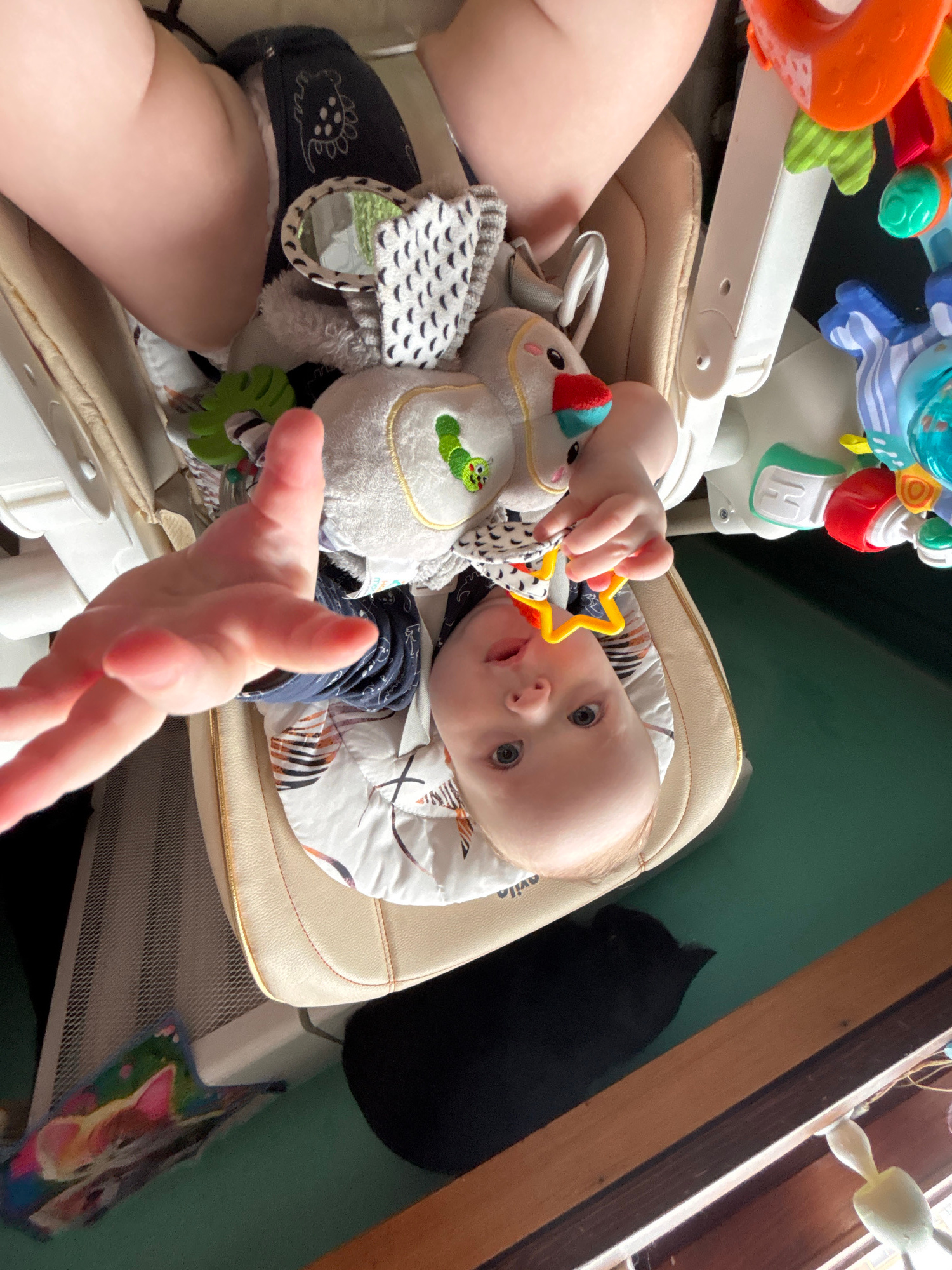 The image shows an infant sitting in a high chair, holding a star-shaped toy. The chair has a patterned cushioned seat. There are other toys attached to the high chair, including a plush toy with a mi…read more