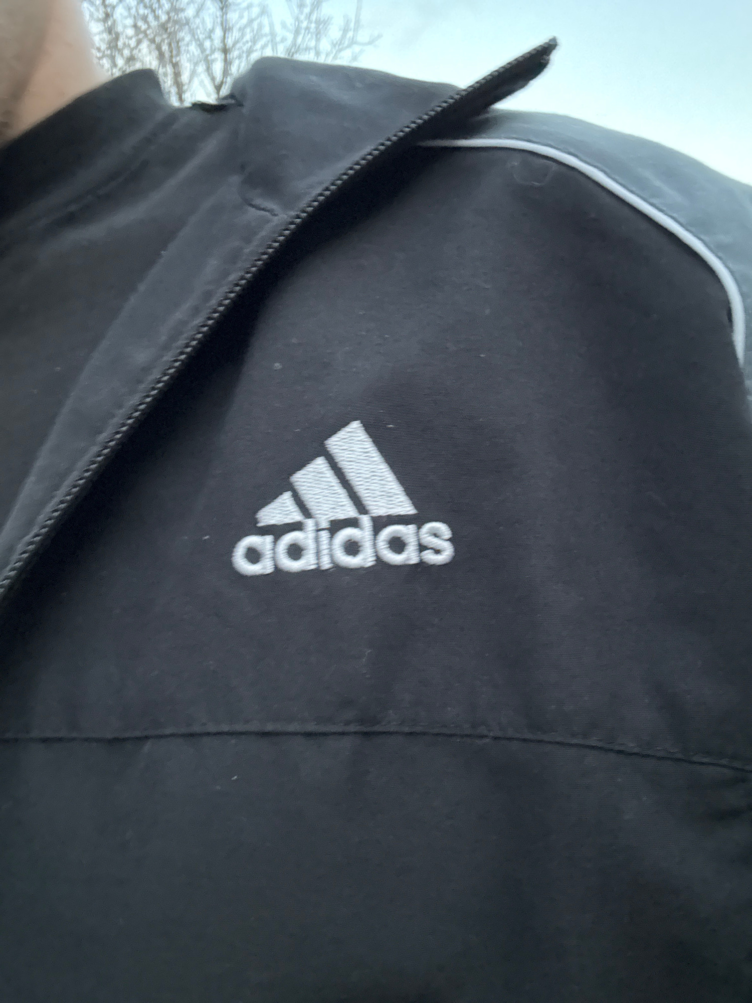 The image shows a close-up of a black Adidas jacket. The Adidas logo is prominently displayed on the jacket. A zipper is visible on the left side. The location is unknown and cannot be determined from…read more