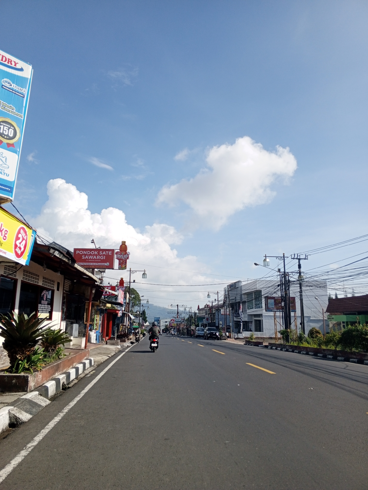 The image shows a street in a town, likely in Indonesia due to the signage. The street is asphalt, with a yellow dividing line and white lines marking the edges. A person on a motorbike is traveling d…read more