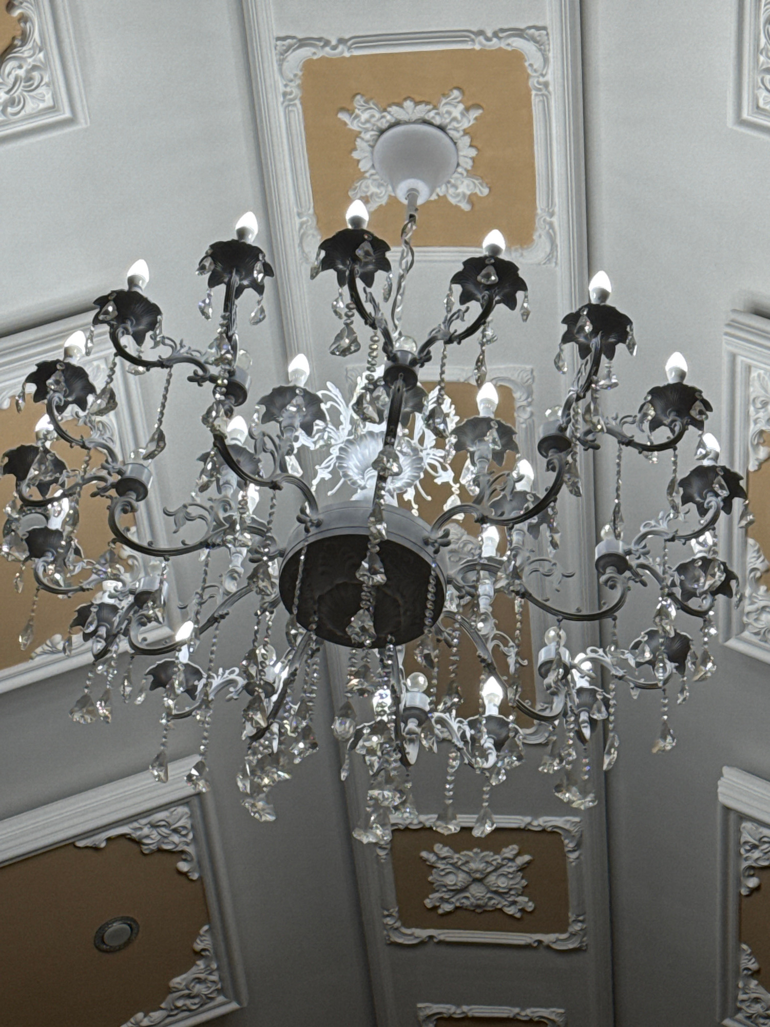 The image shows a view looking up at a chandelier hanging from a ceiling. The chandelier is ornate, with multiple tiers of decorative metal arms, crystal pendants, and lights. The ceiling features decβ¦read more