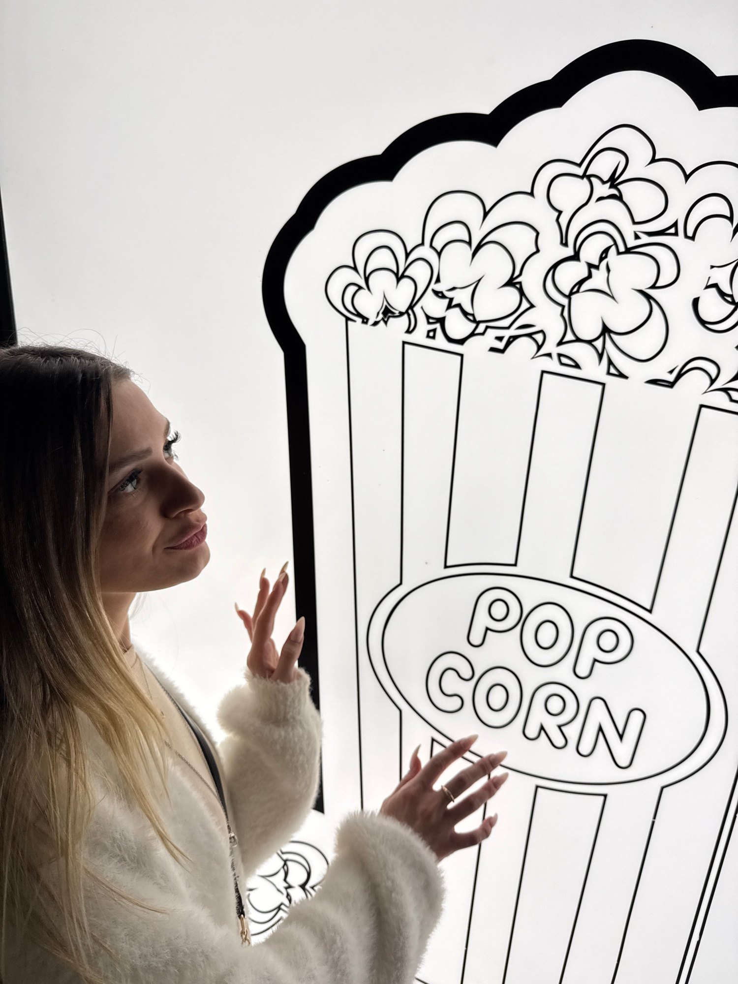 An indoor scene in Reutov, Russia, depicts a young adult female positioned to the left of a large, vertically oriented, backlit graphic. The graphic illustrates a stylized popcorn box with a white bac…read more