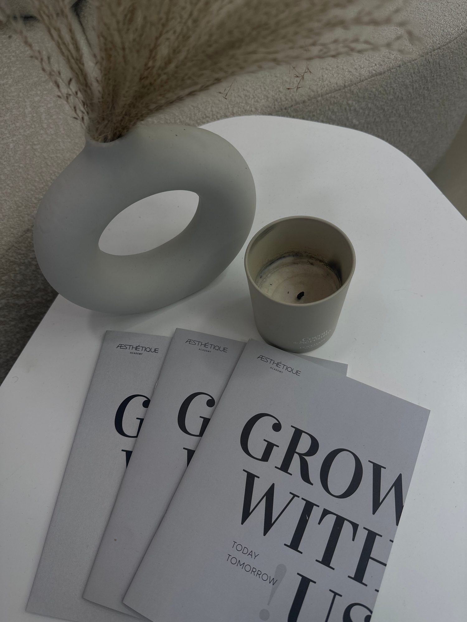 The image shows a tabletop scene, likely indoors, with a minimalist aesthetic. A donut-shaped matte gray vase containing dried pampas grass rests on the left. Beside the vase is a used gray candle hol…read more