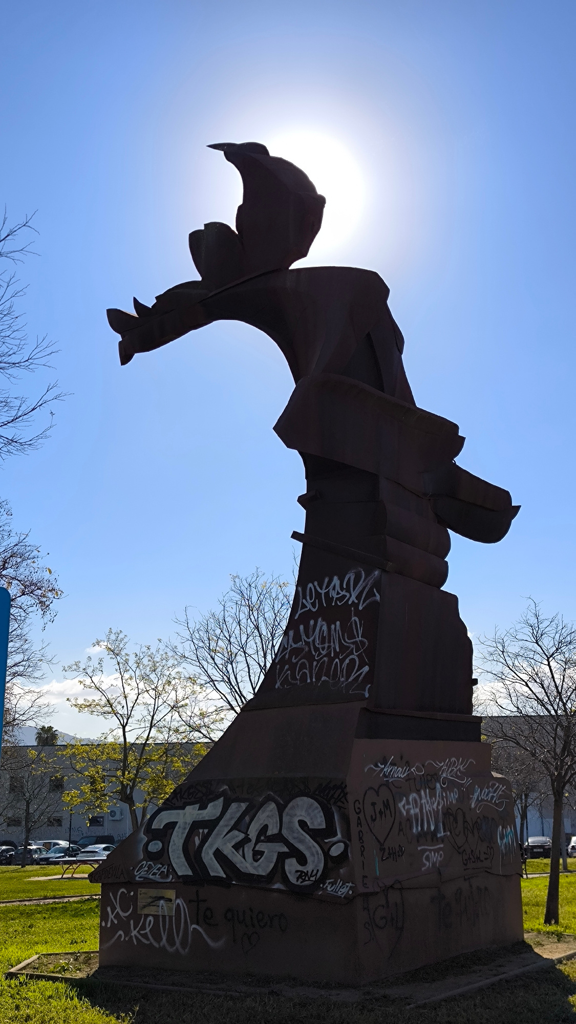 The image shows a tall, abstract metal sculpture silhouetted against a bright blue sky and the sun in Ripollet, Spain. The sculpture is coated in graffiti. The base sits on a patch of green grass. In…read more