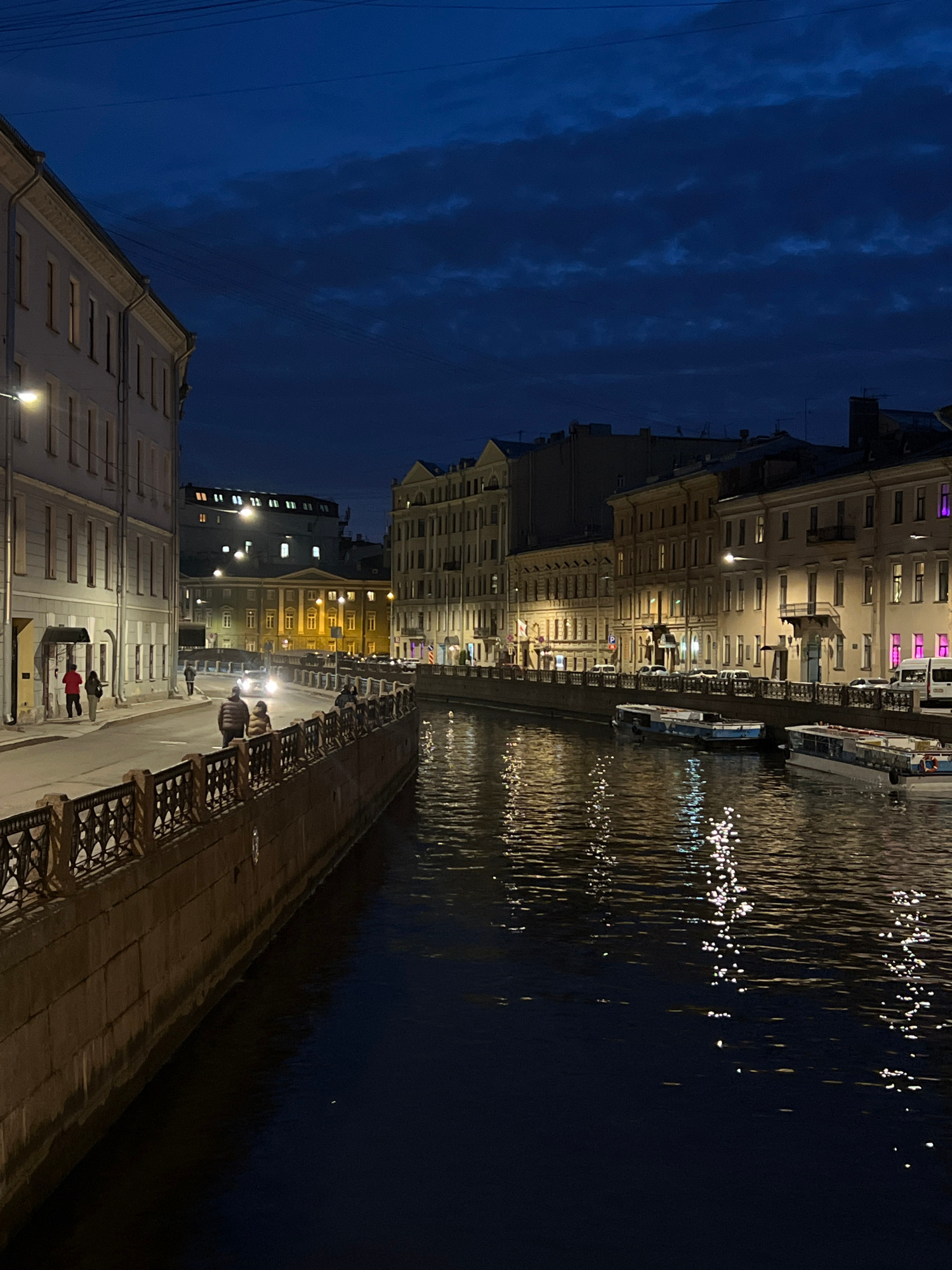 The image depicts a nighttime scene in Saint Petersburg, Russia. A canal runs along the right side of the frame, reflecting the lights from the buildings on the opposite bank, creating shimmering patt…read more