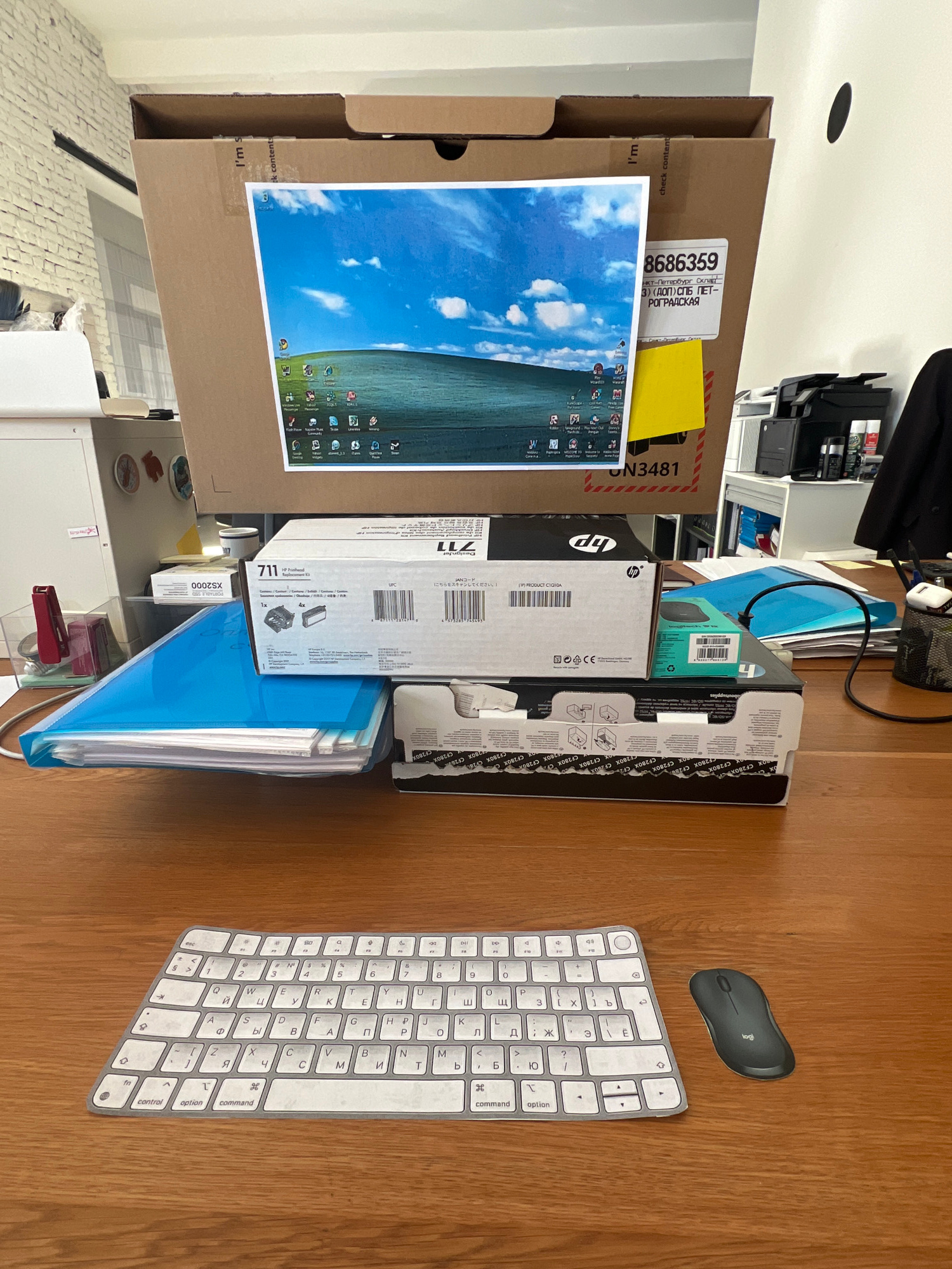 The image displays an indoor desk setting, likely a temporary workstation or a busy home office. The scene is captured with a clear view of a light brown wooden desk surface, illuminated by ambient in…read more