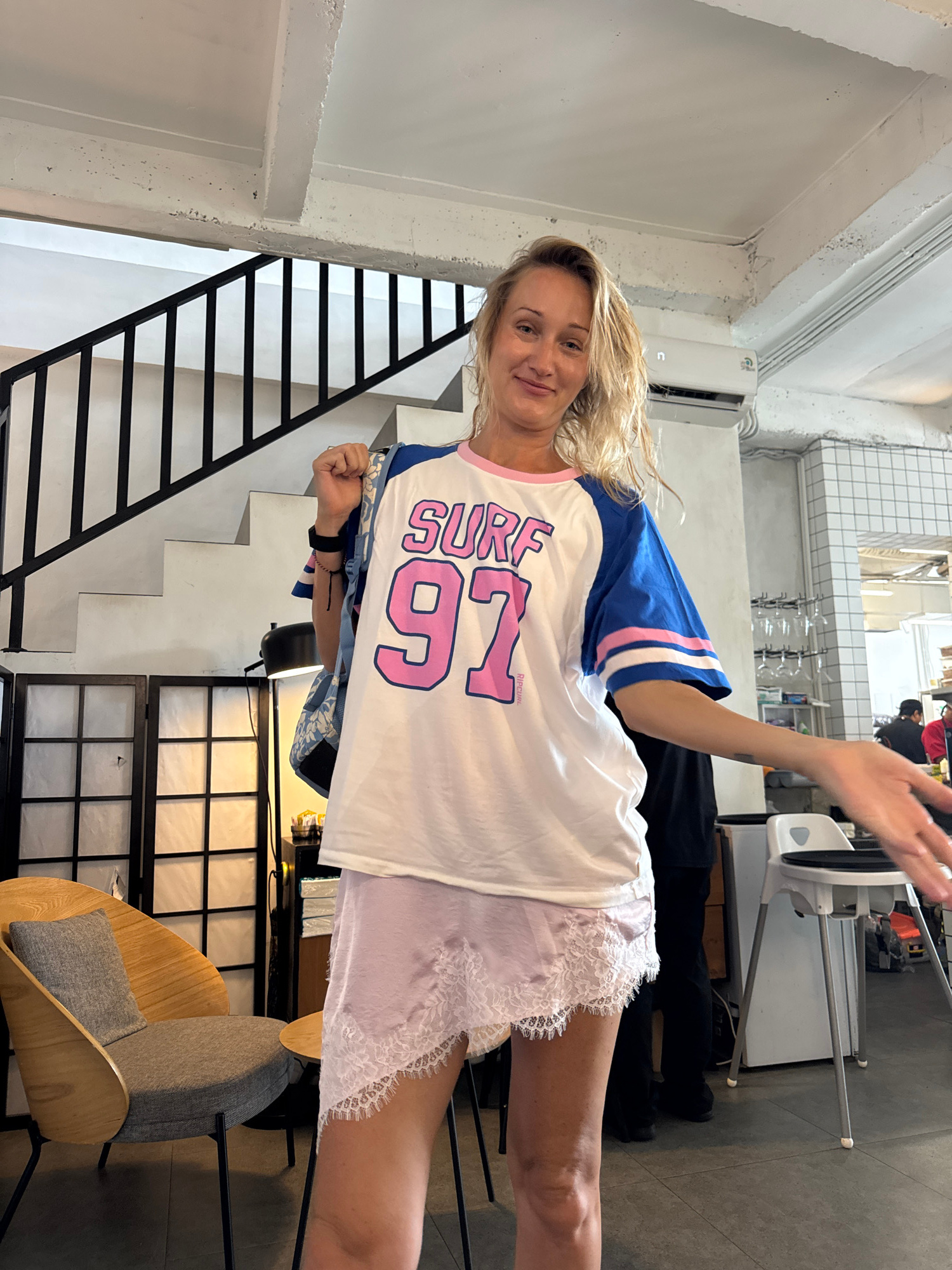 A blonde woman is posing indoors, holding her hand up in a greeting gesture. She is wearing a white t-shirt with blue sleeves and pink lettering and appears to be wearing shorts with lace trim. In the…read more