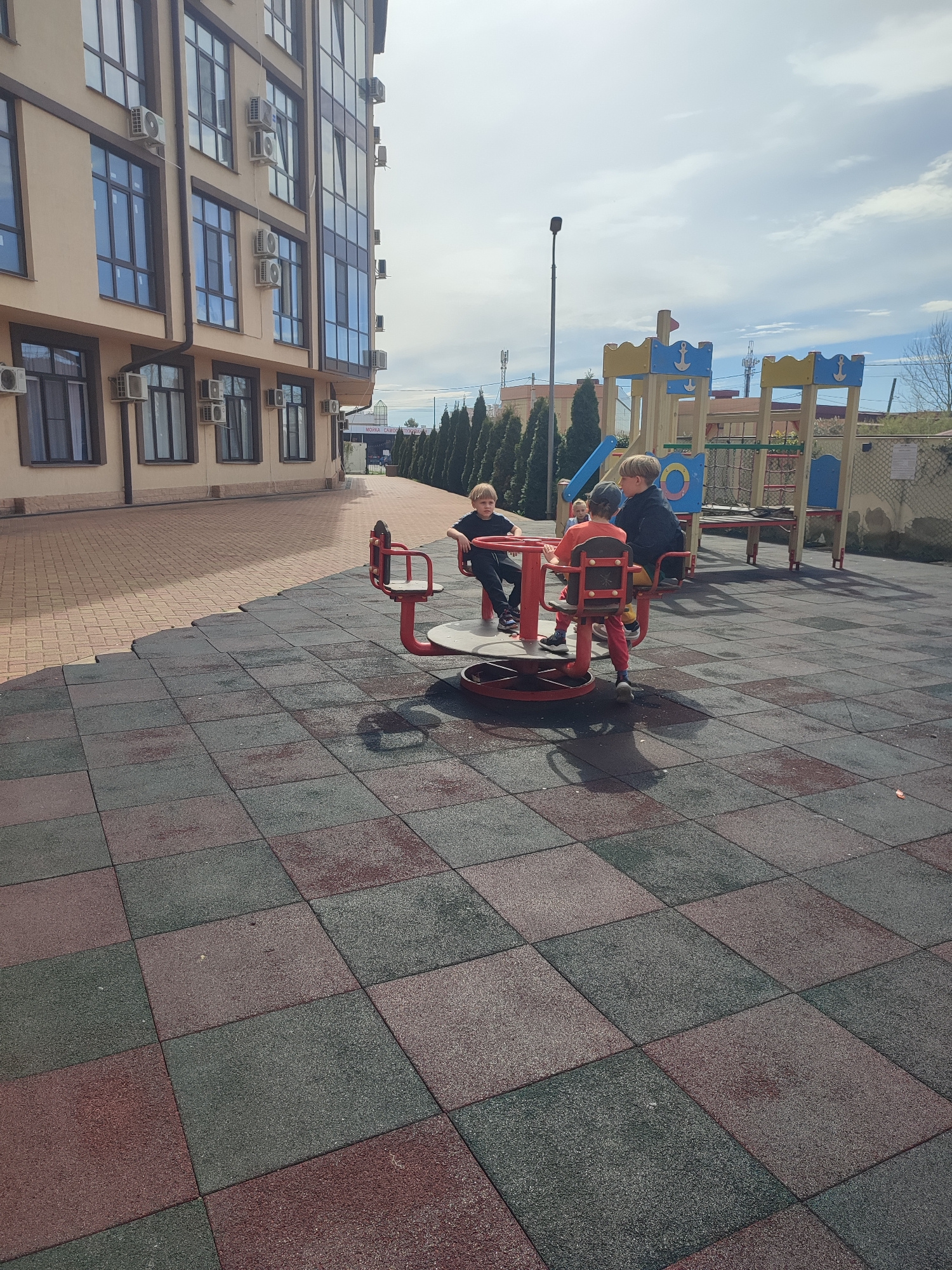 The image depicts a playground scene in Sochi, Russia. Three boys are on a red merry-go-round. One boy is wearing a black shirt and black pants. Another boy wears an orange shirt and red pants. The th…read more