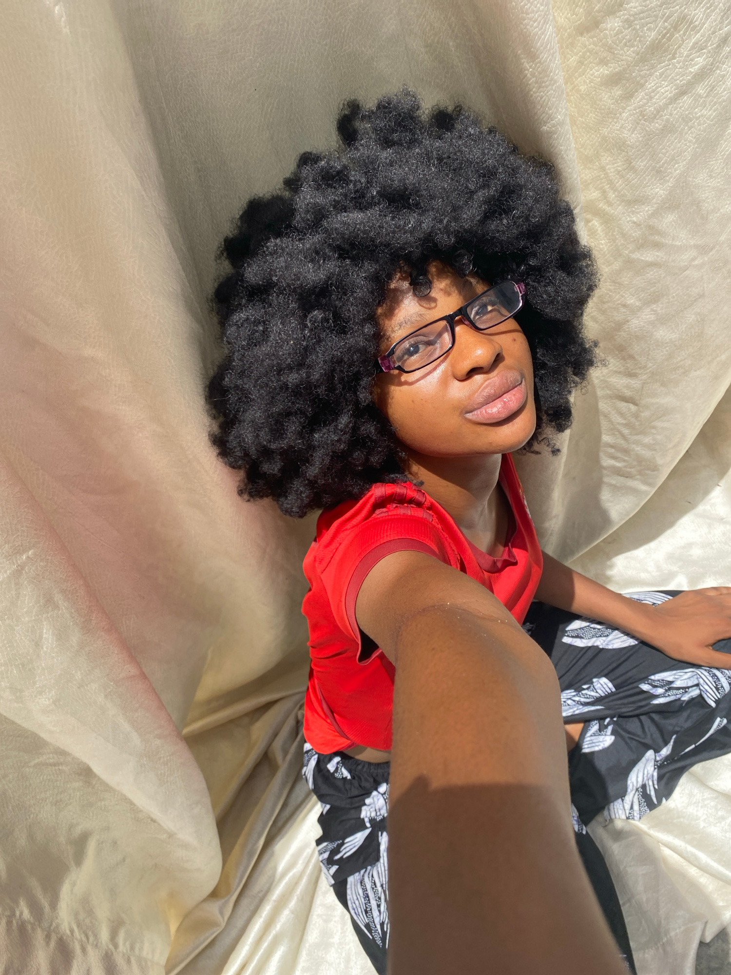 A Black woman with dark, curly hair and glasses lies on a tan fabric surface. She wears a red shirt and patterned pants. Her arm is extended toward the camera. The location is not specified.