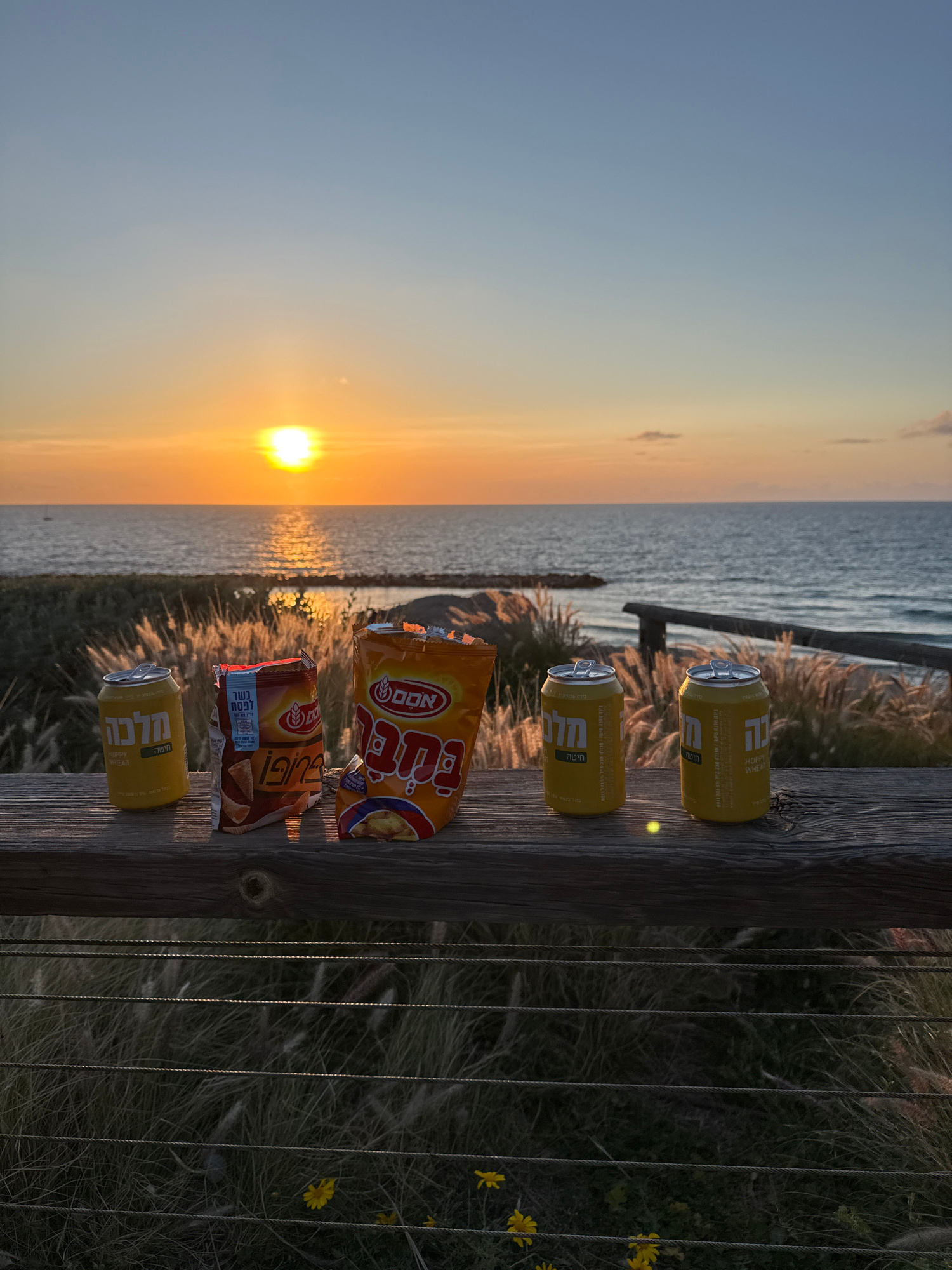 The image shows a scenic overlook at sunset, likely in Tel Aviv, Israel, given the Hebrew writing on the snack and beer containers. A wood railing is in the foreground holding three cans of "Malka" be…read more