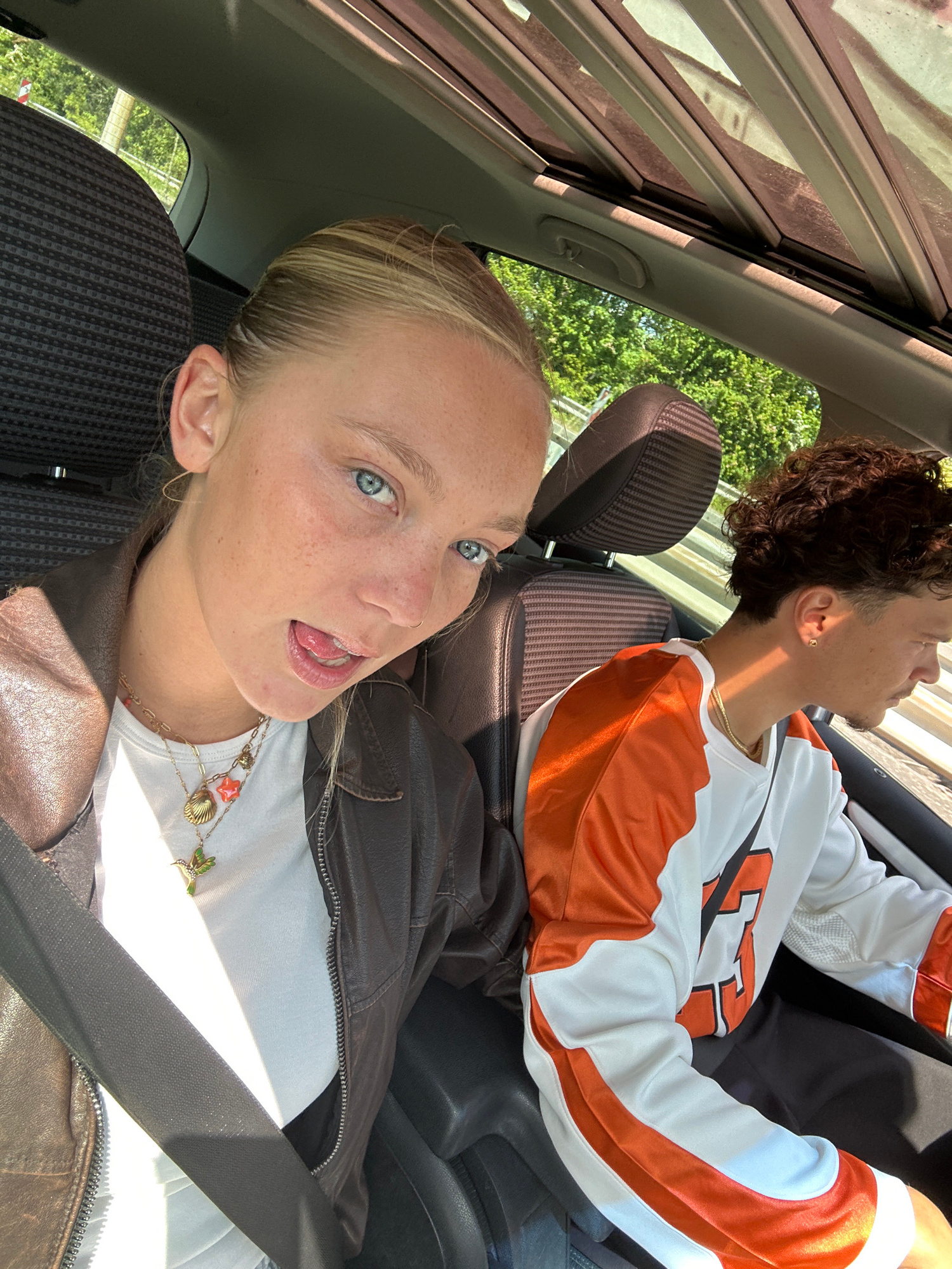 Two individuals are inside a vehicle, likely a car. A woman with blonde hair, wearing a white t-shirt and a brown jacket, is in the foreground, facing the camera with her mouth slightly open. She is w…read more