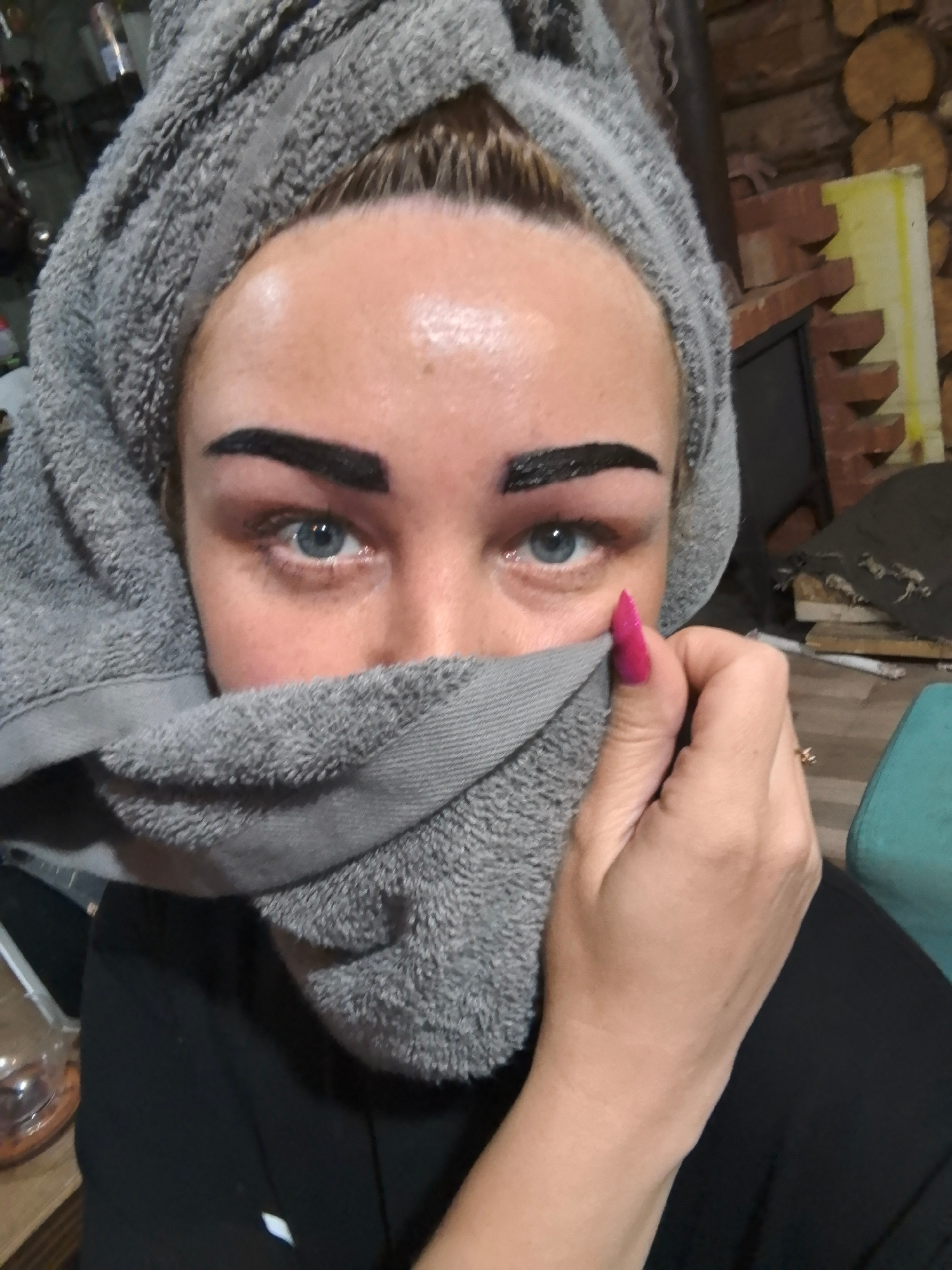 A selfie shows a person with light blue eyes and a gray towel wrapped around their head, also covering the lower half of their face. Their eyebrows are thick and dark. The person’s left hand, featurin…read more