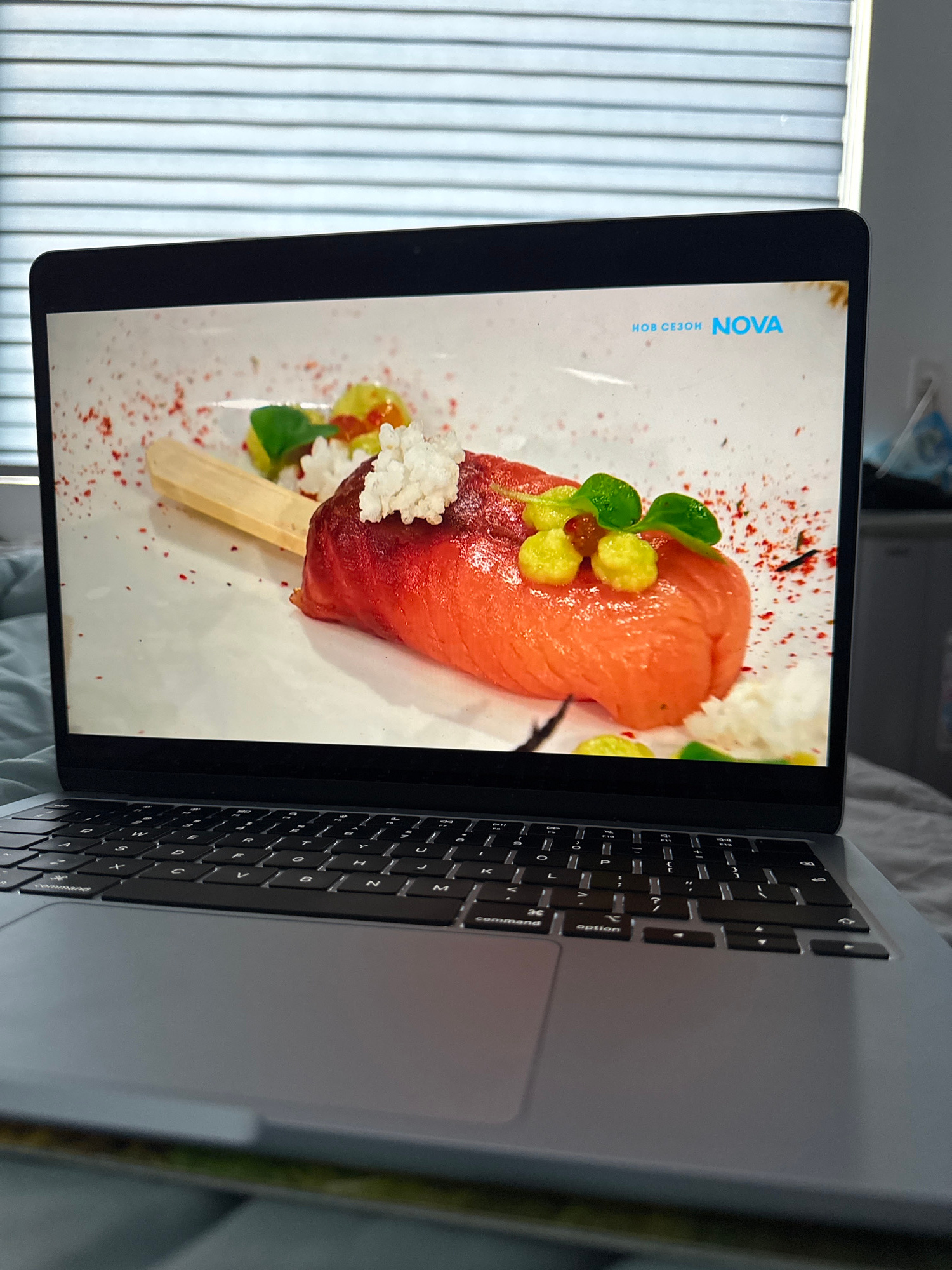 A laptop displays a photo of a dish on a popsicle stick, garnished with what appears to be red pepper flakes, green leaves, and white toppings. "НОВ СЕЗОН NOVA" is printed in blue text on the screen.…read more