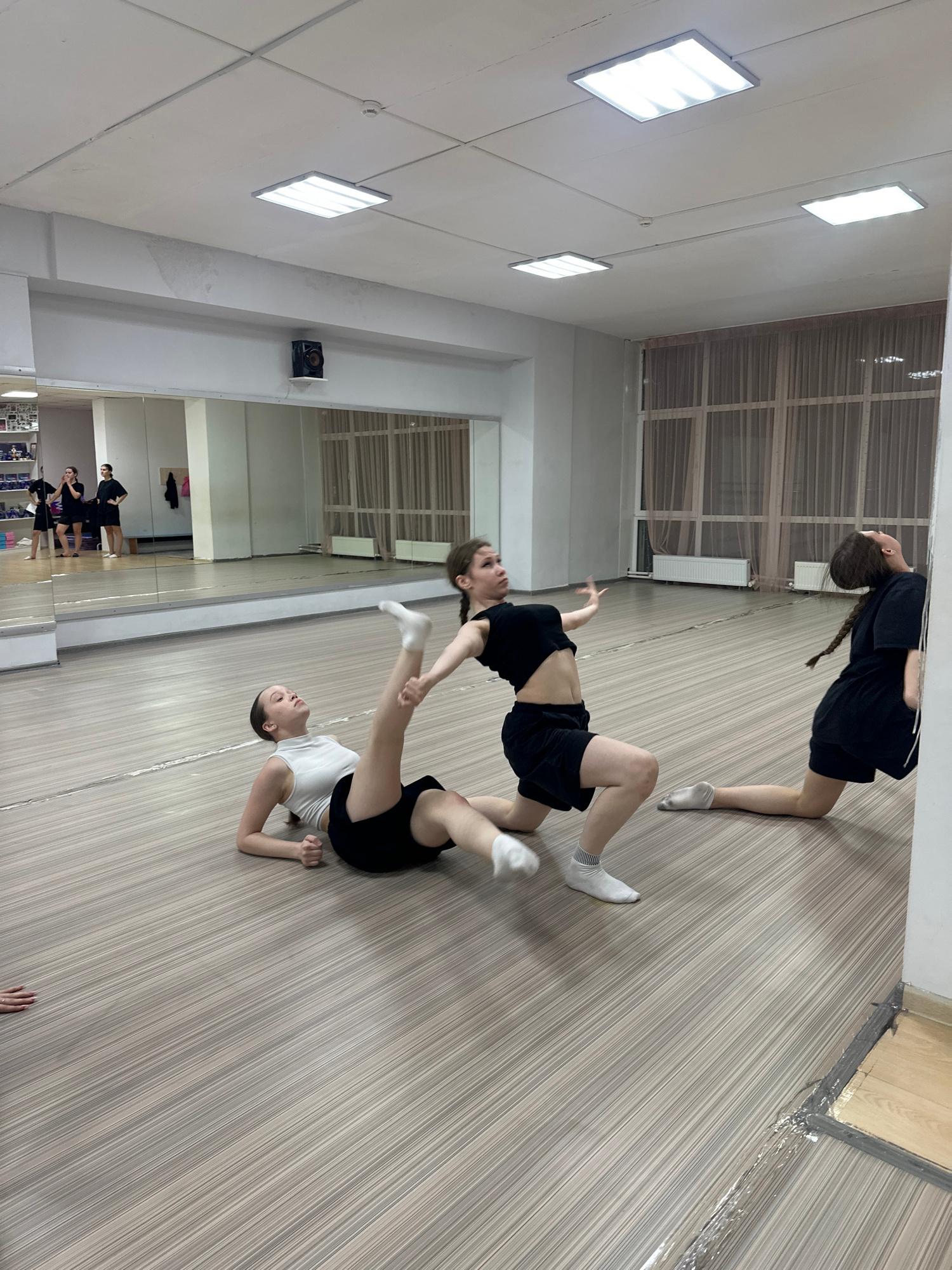 The image captures three women performing a choreographed routine in what appears to be a dance studio or gymnasium. The room is brightly lit with multiple ceiling lights, and the walls are white. A l…read more