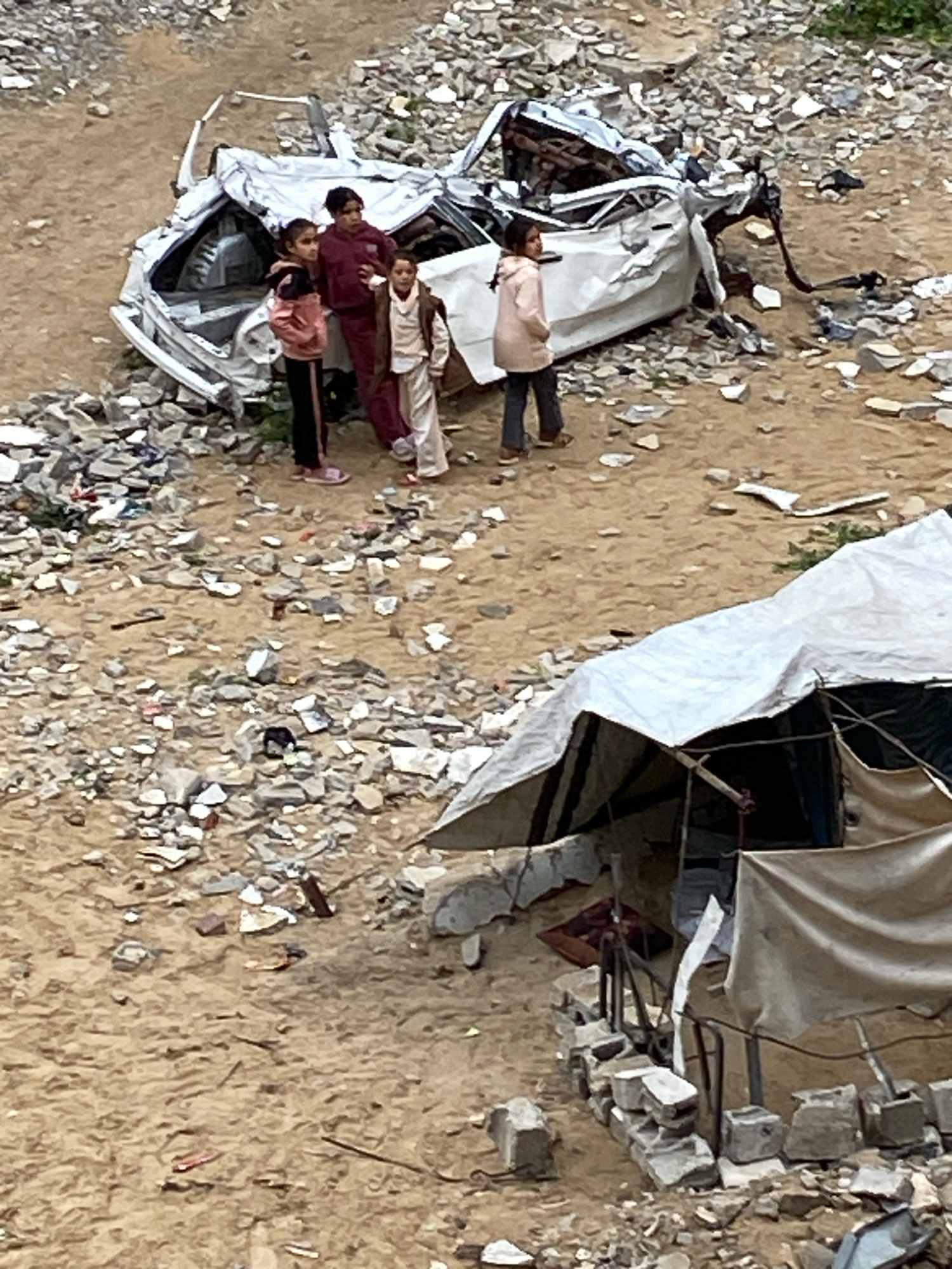 The image shows a destroyed white car with several children standing around it. The car appears heavily damaged, possibly from an explosion or a collision. Nearby there's a makeshift shelter or tent c…read more
