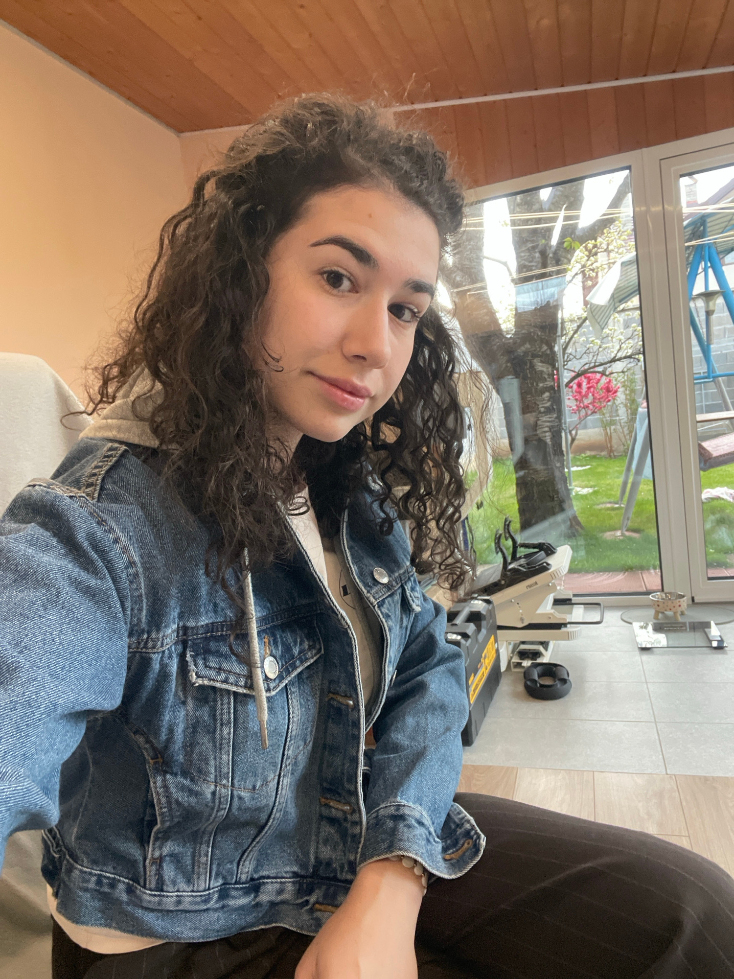 A young woman with curly dark hair is sitting indoors, wearing a denim jacket. A gray pencil rests in the jacket pocket. Outside the window, which is directly behind and above the woman, there's a yar…read more