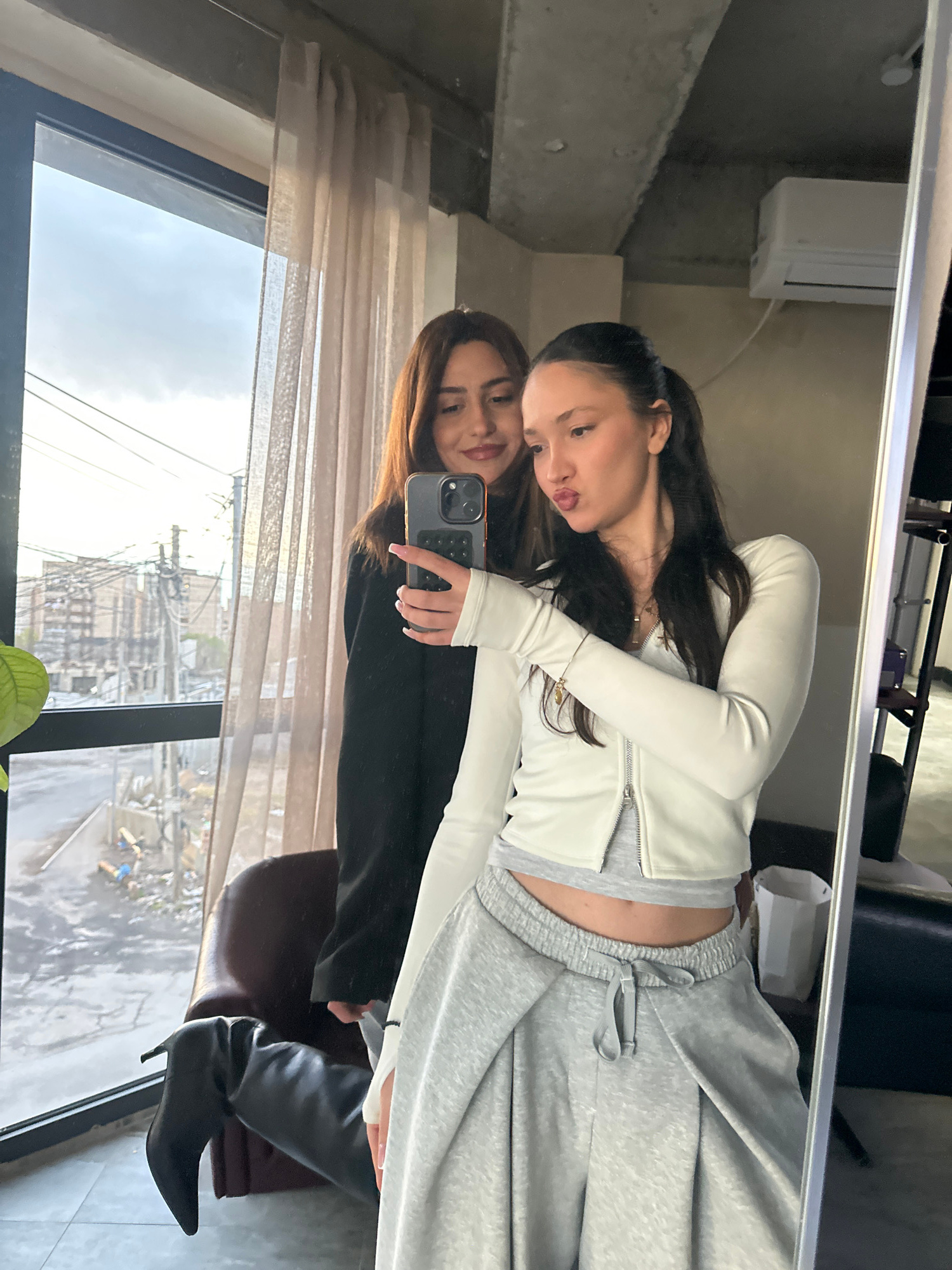 A woman is taking a mirror selfie, holding her phone in front of the mirror. The woman is wearing a long-sleeved white zip-up shirt, grey sweatpants, and black high-heeled boots. Reflected in the mirr…read more