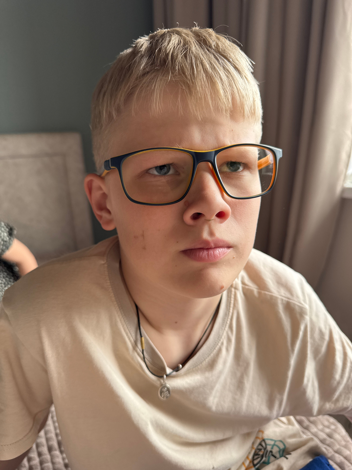 A young person, likely male, with short blonde hair and striking blue-green eyes, is captured in a close-up portrait. The image is rotated approximately 90 degrees counter-clockwise, presenting the su…read more