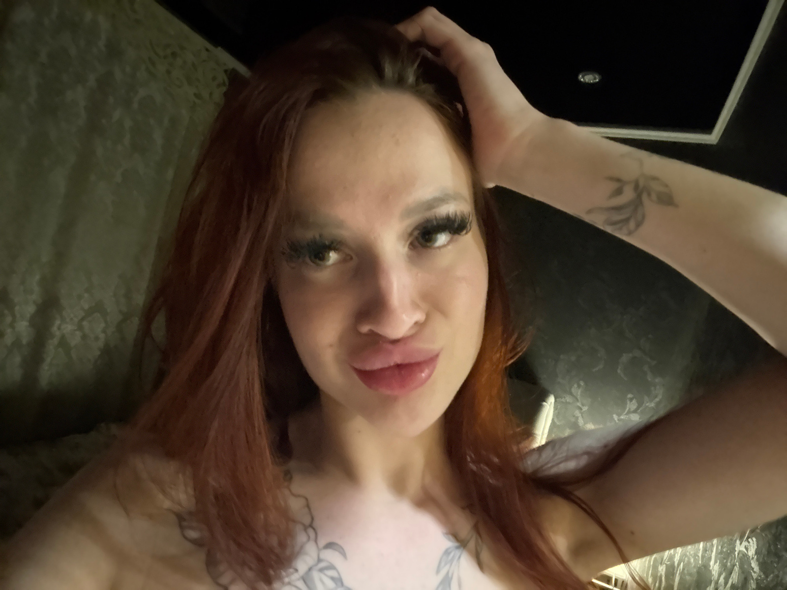 A woman with red hair and tattoos is lying down. She has tattoos on her chest and forearm. She is lying on a bed or a similar surface with a patterned cover. There is no indication of the location be…read more