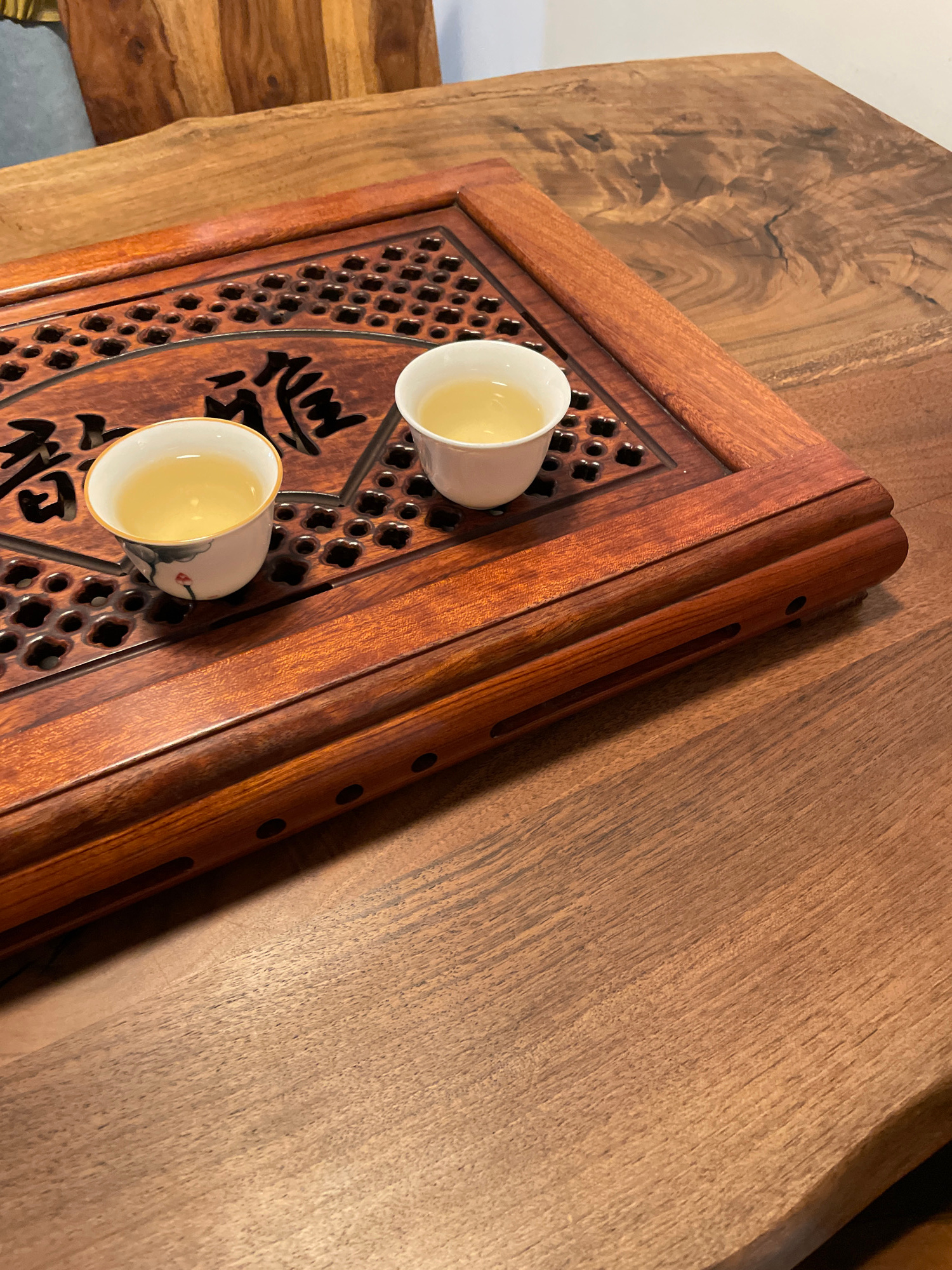 The image presents a close-up, angled view of two white porcelain teacups filled with a light yellow liquid, presumably tea. These cups are placed on a dark brown wooden tea tray featuring intricate c…read more