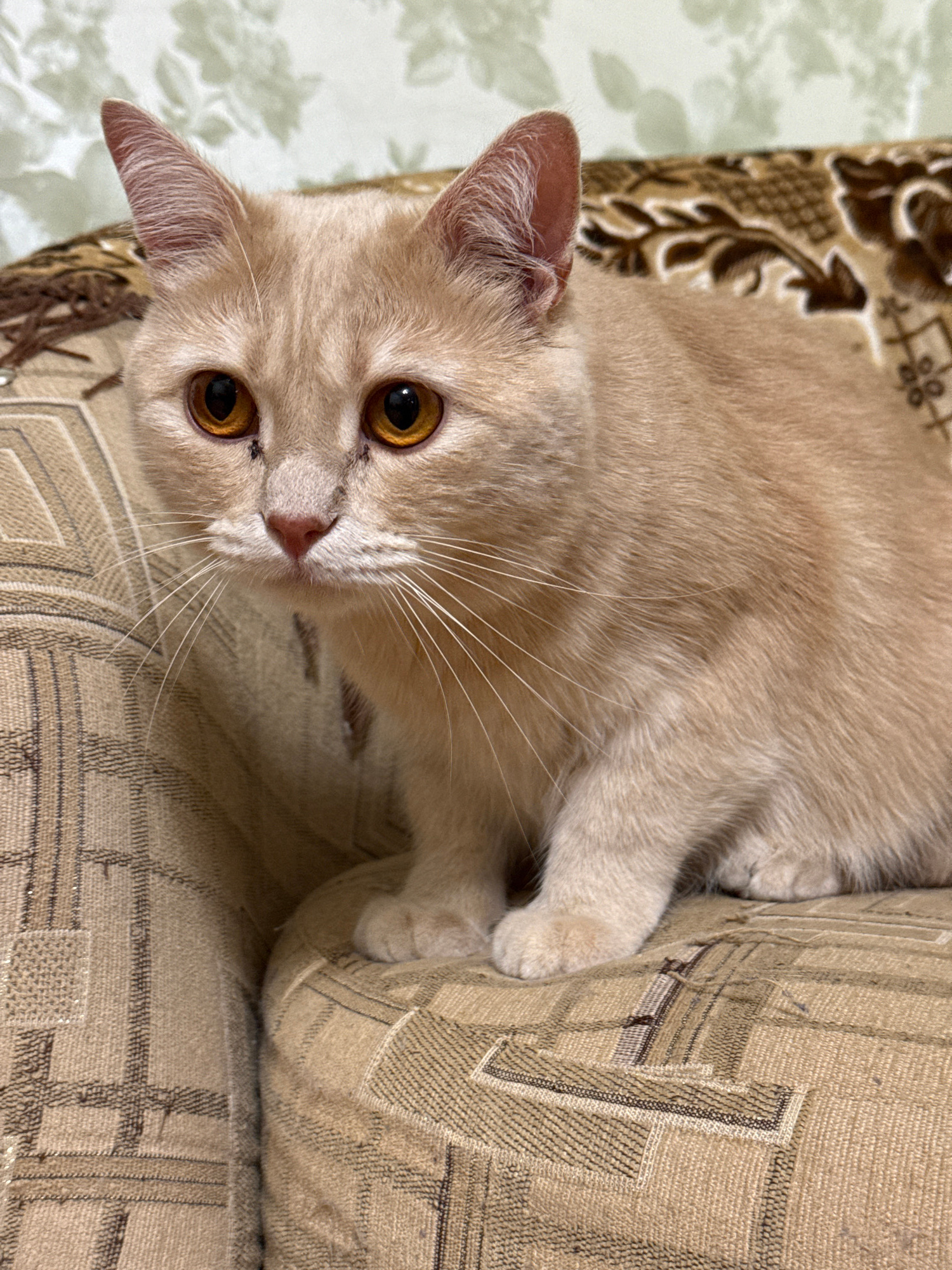 A tan cat with golden eyes lies on a patterned, beige and brown sofa. The cat is positioned mostly on the right side of the frame, nestled into a corner of the sofa. The sofa fabric features a geometr…read more