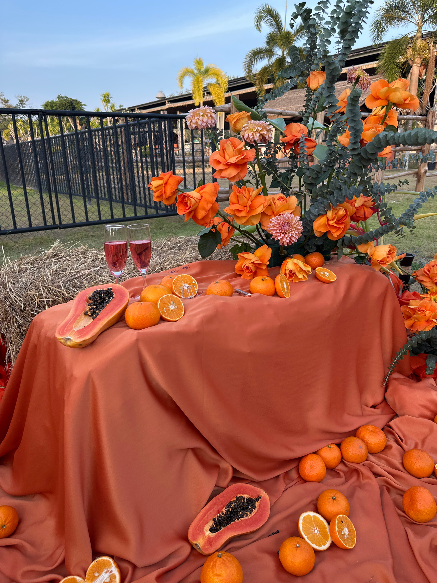 The scene depicts an outdoor decorative display in Si Sunthon, Thailand. A table is draped with a rust-orange fabric, serving as the central element. On the table, two champagne flutes containing a re…read more