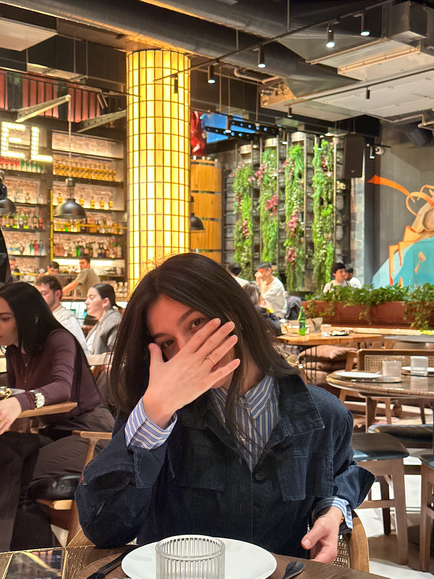The image captures the interior of a restaurant, possibly in Yerevan, Armenia. A woman with long, dark hair is prominently featured, shielding her face with her hand while seated at a table. She wears…read more