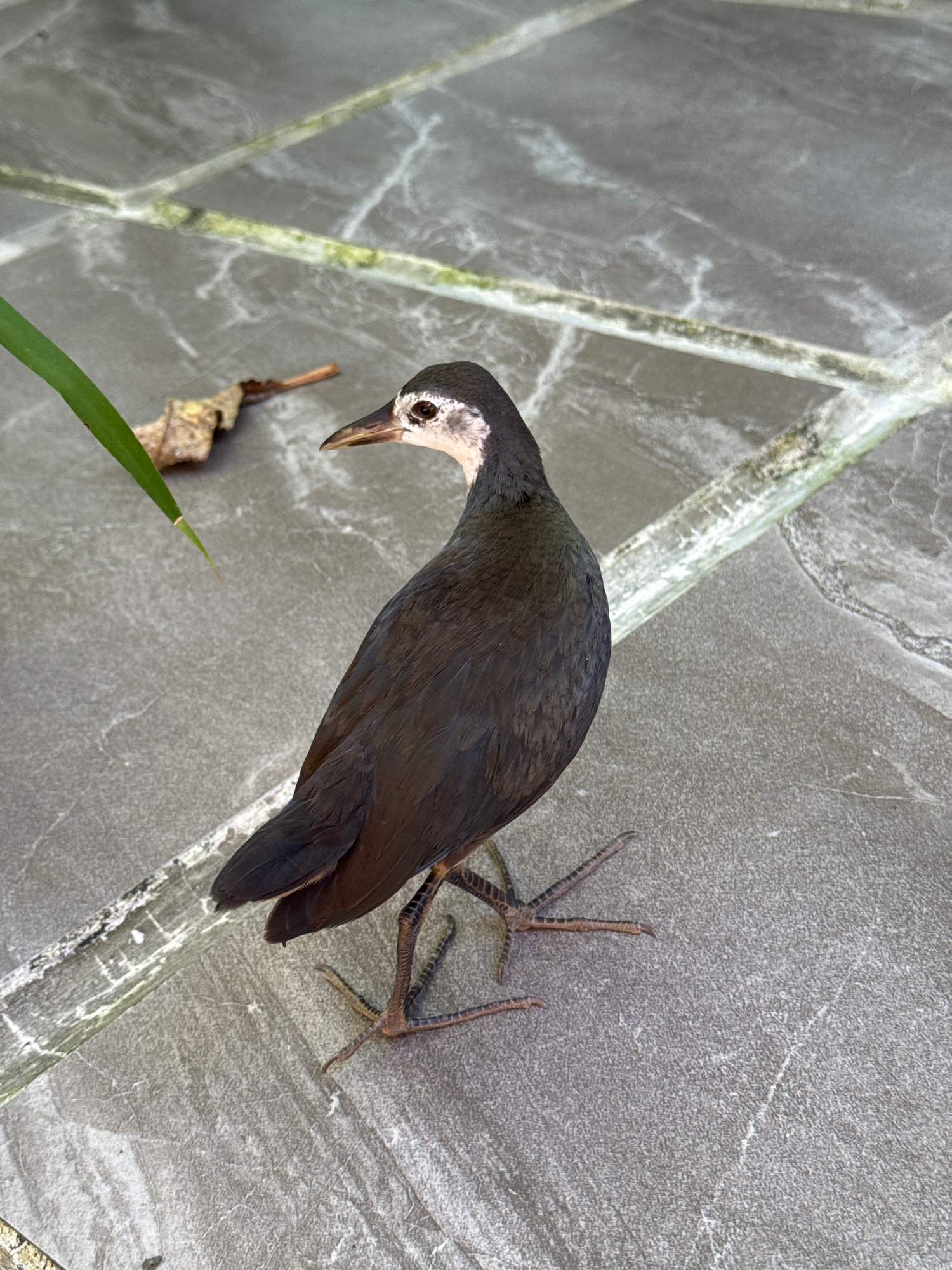 A drab bird with a white face patch is perched on a light gray tiled surface. The bird has long, slender legs and is looking down. A green blade of grass is visible in the lower left corner of the ima…read more