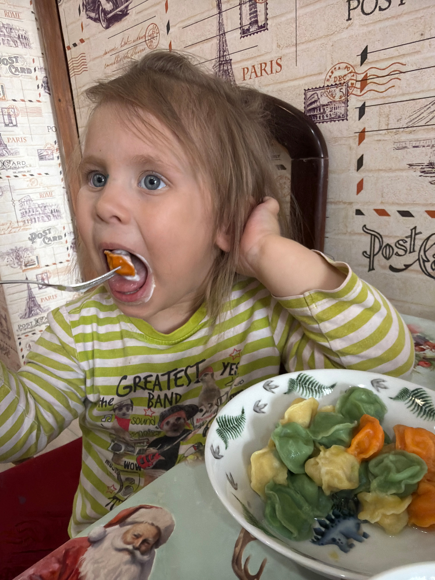 Here is a detailed description of the image: **Scene:** The image shows a young child eating food, seemingly at a table in a home or restaurant. The viewpoint is tilted. **People:** * A child wi…read more